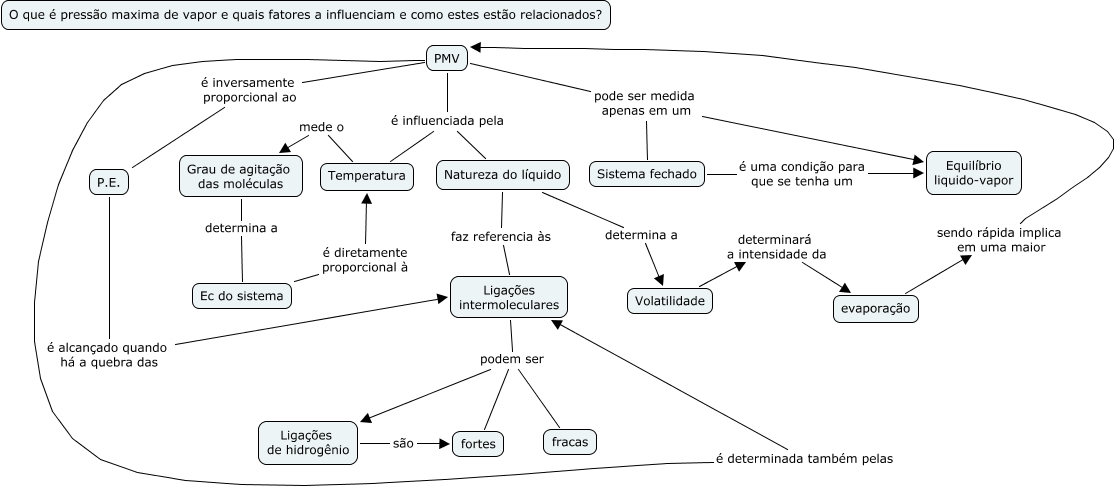 Esse mapa conceitual, produzido no IHMC CmapTools, tem a informação relacionada a: PMV AugustoP e VictorM, PMV é influenciada pela Natureza do líquido, PMV é influenciada pela Temperatura, Ligações intermoleculares podem ser fracas, Grau de agitação das moléculas determina a Ec do sistema, PMV é inversamente proporcional ao P.E., Ligações intermoleculares podem ser fortes, Volatilidade determinará a intensidade da evaporação, PMV é determinada também pelas Ligações intermoleculares, evaporação sendo rápida implica em uma maior PMV, Ligações intermoleculares podem ser Ligações de hidrogênio, P.E. é alcançado quando há a quebra das Ligações intermoleculares, PMV pode ser medida apenas em um Sistema fechado, Ligações de hidrogênio são fortes, Temperatura mede o Grau de agitação das moléculas, Ec do sistema é diretamente proporcional à Temperatura, PMV pode ser medida apenas em um Equilíbrio liquido-vapor, Natureza do líquido faz referencia às Ligações intermoleculares, Natureza do líquido determina a Volatilidade, Sistema fechado é uma condição para que se tenha um Equilíbrio liquido-vapor