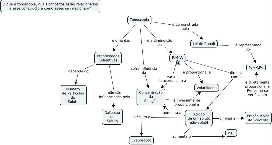 Esse mapa conceitual, produzido no IHMC CmapTools, tem a informação relacionada a: Tonoscopia 3A, Adição de um soluto não-volátil diminui a Fração Molar do Solvente, Adição de um soluto não-volátil aumenta o P.E., Tonoscopia é a diminuição da P.M.V., Adição de um soluto não-volátil dificulta a Evaporação, Lei de Raoult é representada por Pv=X.Pv, P.M.V. varia de acordo com a Concentração da Solução, Tonoscopia é demonstrada pela Lei de Raoult, Propriedades Coligativas não são influenciadas pela Natureza do Soluto, Fração Molar do Solvente é diretamente proporcional a Pv, como se verifica em Pv=X.Pv, Concentração da Solução é inversamente proporcional a Volatilidade, Tonoscopia é uma das Propriedades Coligativas, P.M.V. diminui com a Adição de um soluto não-volátil, Adição de um soluto não-volátil aumenta a Concentração da Solução, Tonoscopia sofre influência da Concentração da Solução, P.M.V. é proporcional a Volatilidade, Propriedades Coligativas depende do Número de Particulas do Soluto