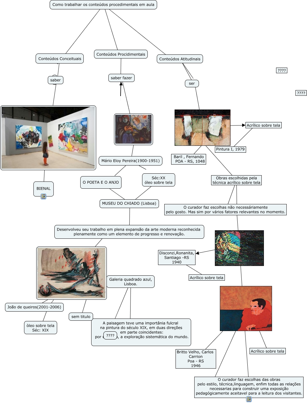 Esse mapa conceitual, produzido no IHMC CmapTools, tem a informação relacionada a: PROFESSOR, PESQUISADOR , CURADOR, ???? Acrílico sobre tela, ???? Britto Velho, Carlos Carrion Poa - RS 1946, Como trabalhar os conteúdos procedimentais em aula Conteúdos Atitudinais,, ???? Acrílico sobre tela, Galeria quadrado azul, Lisboa. ???? A paisagem teve uma importânia fulcral na pintura do século XIX, em duas direções em parte coincidentes: por um lado, a exploração sistemática do mundo., Mário Eloy Pereira(1900-1951) ???? Séc:XX óleo sobre tela, Obras escolhidas pela técnica acrílico sobre tela ????, O POETA E O ANJO ???? MUSEU DO CHIADO (Lisboa), Disconzi,Ronanita, Santiago -RS 1940 ???? Acrílico sobre tela, ???? O curador faz escolhas das obras pelo estilo, técnica,linguagem, enfim todas as relações necessarias para construir uma exposição pedagógicamente aceitavel para a leitura dos visitantes., Conteúdos Atitudinais ser, Conteúdos Atitudinais, ???? Mário Eloy Pereira(1900-1951), Obras escolhidas pela técnica acrílico sobre tela ???? O curador faz escolhas não necessáriamente pelo gosto. Mas sim por vários fatores relevantes no momento., ???? Disconzi,Ronanita, Santiago -RS 1940, Como trabalhar os conteúdos procedimentais em aula Conteúdos Procidimentais, Mário Eloy Pereira(1900-1951) ???? O POETA E O ANJO, ???? O curador faz escolhas das obras pelo estilo, técnica,linguagem, enfim todas as relações necessarias para construir uma exposição pedagógicamente aceitavel para a leitura dos visitantes., ???? Galeria quadrado azul, Lisboa.
