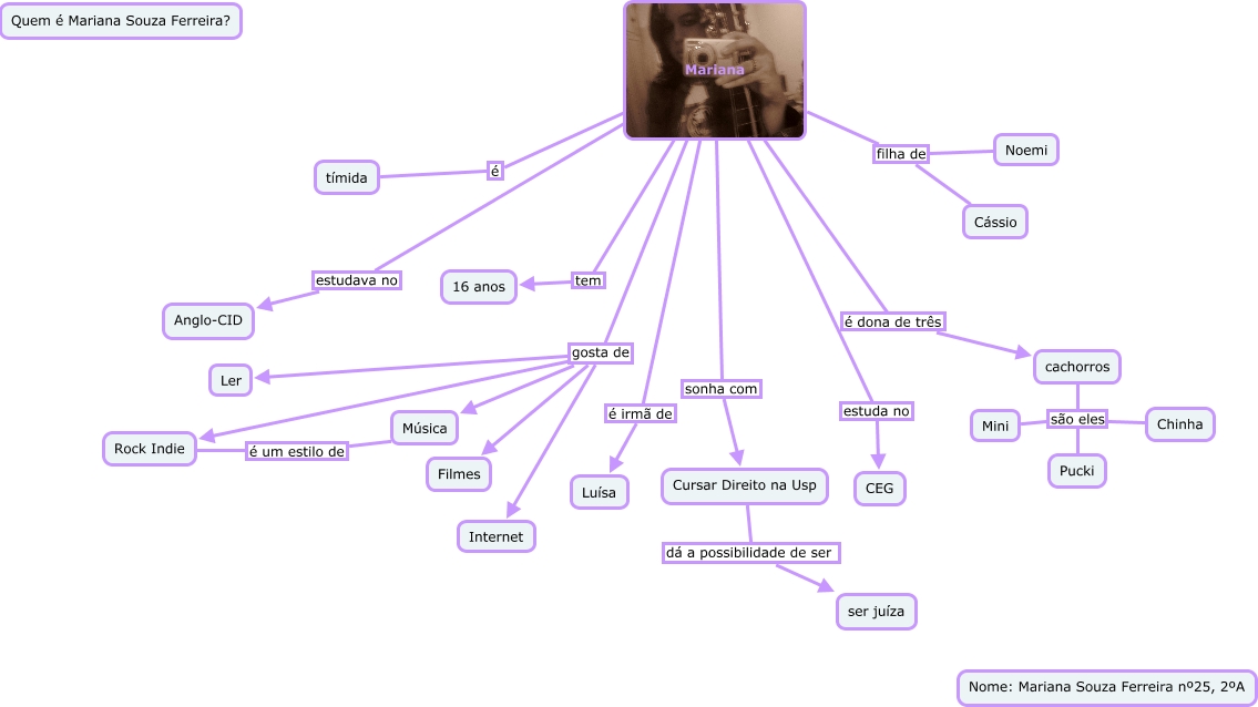Esse mapa conceitual, produzido no IHMC CmapTools, tem a informação relacionada a: Mapa 1, Mariana é irmã de Luísa, Mariana gosta de Ler, Mariana tem 16 anos, Mariana filha de Cássio, Mariana é dona de três cachorros, Mariana filha de Noemi, cachorros são eles Mini, Rock Indie é um estilo de Música, Mariana gosta de Rock Indie, Mariana estuda no CEG, Cursar Direito na Usp dá a possibilidade de ser ser juíza, Mariana gosta de Filmes, Mariana gosta de Internet, Mariana gosta de Música, Mariana sonha com Cursar Direito na Usp, Mariana estudava no Anglo-CID, Mariana é tímida, cachorros são eles Chinha, cachorros são eles Pucki