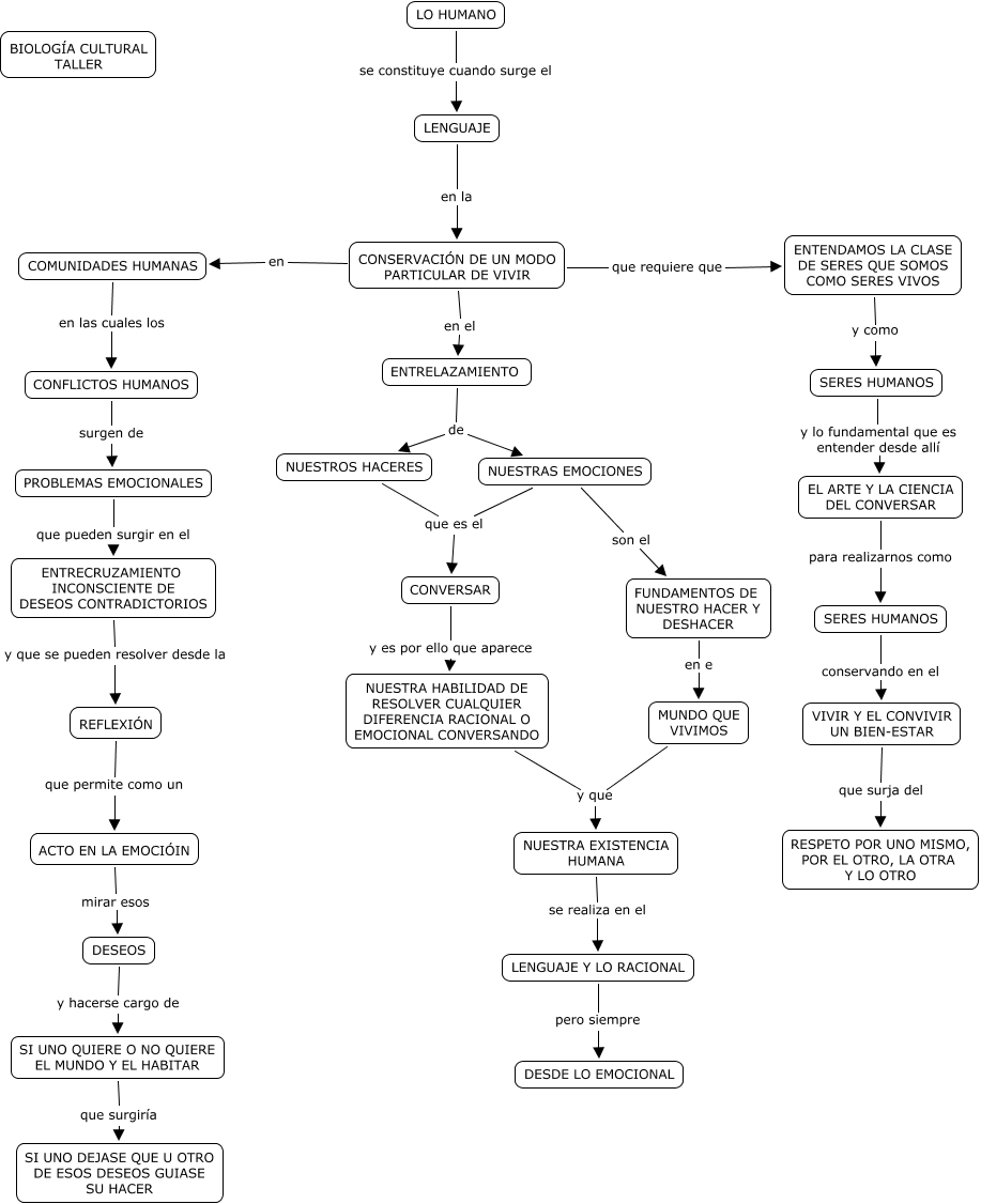 Este Cmap, tiene información relacionada con: LO HUMANO, SI UNO QUIERE O NO QUIERE EL MUNDO Y EL HABITAR que surgiría SI UNO DEJASE QUE U OTRO DE ESOS DESEOS GUIASE SU HACER, PROBLEMAS EMOCIONALES que pueden surgir en el ENTRECRUZAMIENTO INCONSCIENTE DE DESEOS CONTRADICTORIOS, NUESTRA HABILIDAD DE RESOLVER CUALQUIER DIFERENCIA RACIONAL O EMOCIONAL CONVERSANDO y que NUESTRA EXISTENCIA HUMANA, ENTRECRUZAMIENTO INCONSCIENTE DE DESEOS CONTRADICTORIOS y que se pueden resolver desde la REFLEXIÓN, MUNDO QUE VIVIMOS y que NUESTRA EXISTENCIA HUMANA, NUESTRAS EMOCIONES son el FUNDAMENTOS DE NUESTRO HACER Y DESHACER, ACTO EN LA EMOCIÓIN mirar esos DESEOS, CONSERVACIÓN DE UN MODO PARTICULAR DE VIVIR que requiere que ENTENDAMOS LA CLASE DE SERES QUE SOMOS COMO SERES VIVOS, ENTRELAZAMIENTO de NUESTROS HACERES, NUESTRAS EMOCIONES que es el CONVERSAR, ENTENDAMOS LA CLASE DE SERES QUE SOMOS COMO SERES VIVOS y como SERES HUMANOS, FUNDAMENTOS DE NUESTRO HACER Y DESHACER en e MUNDO QUE VIVIMOS, COMUNIDADES HUMANAS en las cuales los CONFLICTOS HUMANOS, CONVERSAR y es por ello que aparece NUESTRA HABILIDAD DE RESOLVER CUALQUIER DIFERENCIA RACIONAL O EMOCIONAL CONVERSANDO, NUESTROS HACERES que es el CONVERSAR, VIVIR Y EL CONVIVIR UN BIEN-ESTAR que surja del RESPETO POR UNO MISMO, POR EL OTRO, LA OTRA Y LO OTRO, CONSERVACIÓN DE UN MODO PARTICULAR DE VIVIR en el ENTRELAZAMIENTO, CONFLICTOS HUMANOS surgen de PROBLEMAS EMOCIONALES, REFLEXIÓN que permite como un ACTO EN LA EMOCIÓIN, LENGUAJE en la CONSERVACIÓN DE UN MODO PARTICULAR DE VIVIR