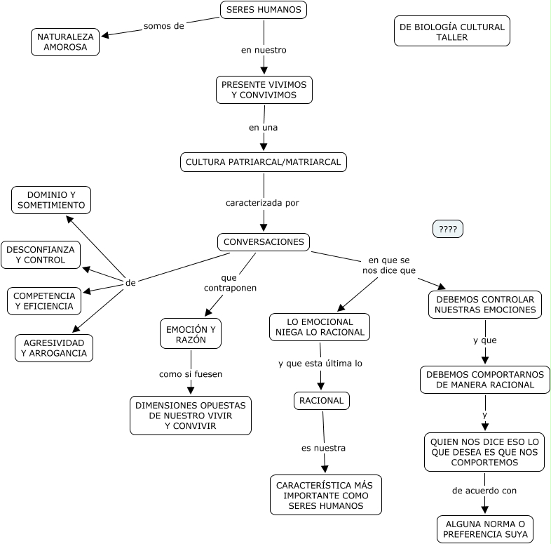 Este Cmap, tiene información relacionada con: SERES HUMANOS 4, DEBEMOS CONTROLAR NUESTRAS EMOCIONES y que DEBEMOS COMPORTARNOS DE MANERA RACIONAL, CONVERSACIONES de COMPETENCIA Y EFICIENCIA, PRESENTE VIVIMOS Y CONVIVIMOS en una CULTURA PATRIARCAL/MATRIARCAL, EMOCIÓN Y RAZÓN como si fuesen DIMENSIONES OPUESTAS DE NUESTRO VIVIR Y CONVIVIR, CONVERSACIONES en que se nos dice que LO EMOCIONAL NIEGA LO RACIONAL, CONVERSACIONES en que se nos dice que DEBEMOS CONTROLAR NUESTRAS EMOCIONES, RACIONAL es nuestra CARACTERÍSTICA MÁS IMPORTANTE COMO SERES HUMANOS, CONVERSACIONES de DOMINIO Y SOMETIMIENTO, QUIEN NOS DICE ESO LO QUE DESEA ES QUE NOS COMPORTEMOS de acuerdo con ALGUNA NORMA O PREFERENCIA SUYA, LO EMOCIONAL NIEGA LO RACIONAL y que esta última lo RACIONAL, CULTURA PATRIARCAL/MATRIARCAL caracterizada por CONVERSACIONES, SERES HUMANOS en nuestro PRESENTE VIVIMOS Y CONVIVIMOS, DEBEMOS COMPORTARNOS DE MANERA RACIONAL y QUIEN NOS DICE ESO LO QUE DESEA ES QUE NOS COMPORTEMOS, SERES HUMANOS somos de NATURALEZA AMOROSA, CONVERSACIONES que contraponen EMOCIÓN Y RAZÓN, CONVERSACIONES de AGRESIVIDAD Y ARROGANCIA, CONVERSACIONES de DESCONFIANZA Y CONTROL