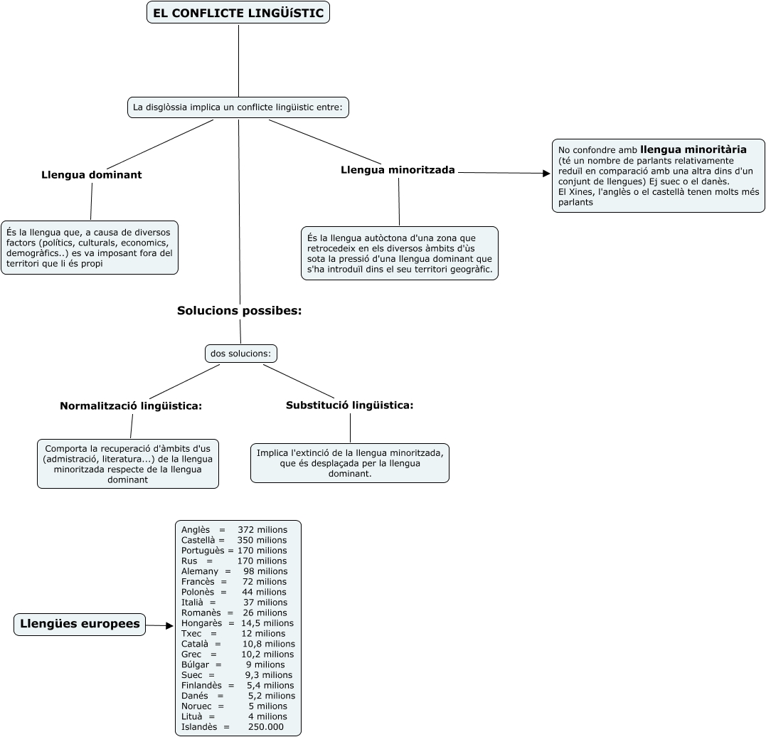 Este Cmap, tiene información relacionada con: conflicte lingüistic, dos solucions: Normalització lingüistica: Comporta la recuperació d'àmbits d'us (admistració, literatura...) de la llengua minoritzada respecte de la llengua dominant, EL CONFLICTE LINGÜíSTIC ???? La disglòssia implica un conflicte lingüistic entre:, La disglòssia implica un conflicte lingüistic entre: Llengua dominant És la llengua que, a causa de diversos factors (polítics, culturals, economics, demogràfics..) es va imposant fora del territori que li és propi, La disglòssia implica un conflicte lingüistic entre: Llengua minoritzada És la llengua autòctona d'una zona que retrocedeix en els diversos àmbits d'ùs sota la pressió d'una llengua dominant que s'ha introduïl dins el seu territori geogràfic., La disglòssia implica un conflicte lingüistic entre: Llengua minoritzada No confondre amb llengua minoritària (té un nombre de parlants relativamente reduïl en comparació amb una altra dins d'un conjunt de llengues) Ej suec o el danès. El Xines, l'anglès o el castellà tenen molts més parlants, La disglòssia implica un conflicte lingüistic entre: Solucions possibes: dos solucions:, Llengües europees Anglès = 372 milions Castellà = 350 milions Portuguès = 170 milions Rus = 170 milions Alemany = 98 milions Francès = 72 milions Polonès = 44 milions Italià = 37 milions Romanès = 26 milions Hongarès = 14,5 milions Txec = 12 milions Català = 10,8 milions Grec = 10,2 milions Búlgar = 9 milions Suec = 9,3 milions Finlandès = 5,4 milions Danés = 5,2 milions Noruec = 5 milions Lituà = 4 milions Islandès = 250.000, dos solucions: Substitució lingüistica: Implica l'extinció de la llengua minoritzada, que és desplaçada per la llengua dominant.