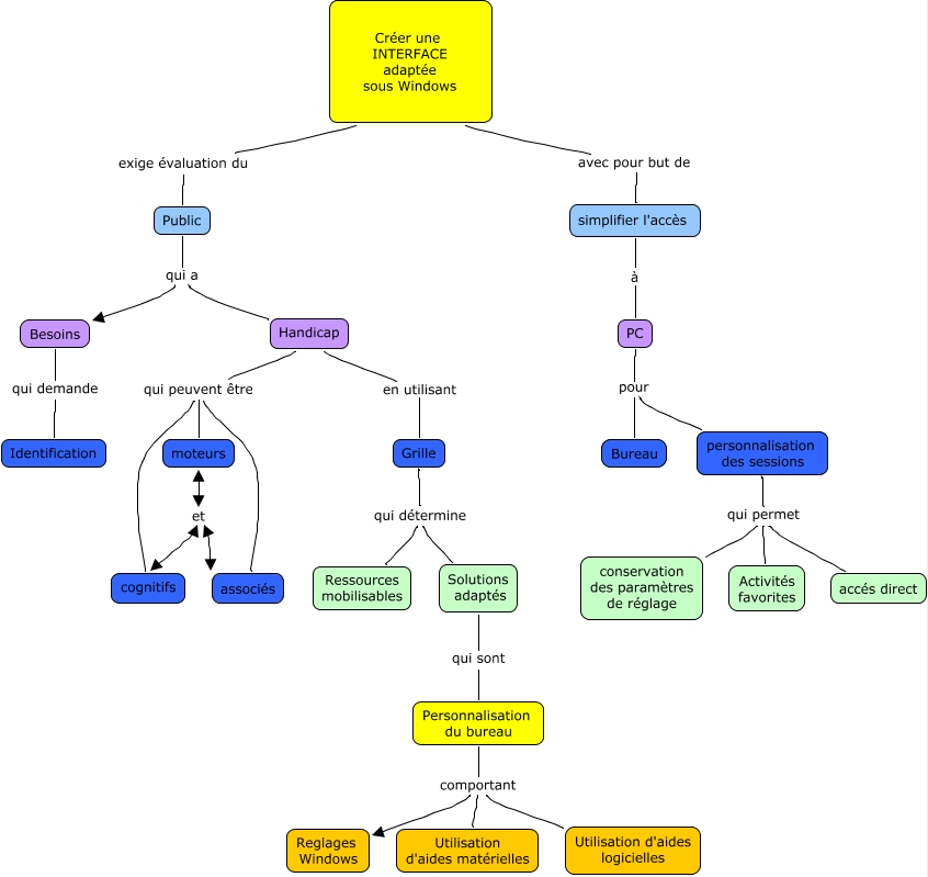 This Concept Map, created with IHMC CmapTools, has information related to: Bureau-adapté1, Besoins qui demande Identification, Handicap qui peuvent être moteurs, Handicap qui peuvent être cognitifs, moteurs et cognitifs, Solutions adaptés qui sont Personnalisation du bureau, Handicap en utilisant Grille, Créer une INTERFACE adaptée sous Windows avec pour but de simplifier l'accès, personnalisation des sessions qui permet conservation des paramètres de réglage, Personnalisation du bureau comportant Utilisation d'aides logicielles, Public qui a Besoins, Grille qui détermine Solutions adaptés, Créer une INTERFACE adaptée sous Windows exige évaluation du Public, Handicap qui peuvent être associés, PC pour Bureau, simplifier l'accès à PC, personnalisation des sessions qui permet accés direct, Personnalisation du bureau comportant Utilisation d'aides matérielles, Grille qui détermine Ressources mobilisables, PC pour personnalisation des sessions, Personnalisation du bureau comportant Reglages Windows