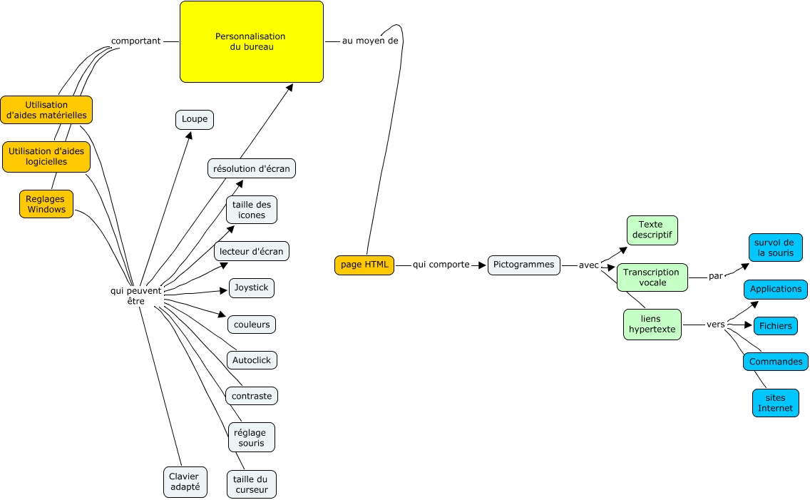 This Concept Map, created with IHMC CmapTools, has information related to: Bureau-adapté2, Utilisation d'aides matérielles qui peuvent être taille des icones, Utilisation d'aides logicielles qui peuvent être Joystick, Reglages Windows qui peuvent être résolution d'écran, Utilisation d'aides logicielles qui peuvent être contraste, Reglages Windows qui peuvent être réglage souris, Utilisation d'aides logicielles qui peuvent être couleurs, Reglages Windows qui peuvent être couleurs, Utilisation d'aides matérielles qui peuvent être Personnalisation du bureau, Reglages Windows qui peuvent être Personnalisation du bureau, Reglages Windows qui peuvent être taille du curseur, Utilisation d'aides logicielles qui peuvent être taille des icones, Utilisation d'aides matérielles qui peuvent être contraste, liens hypertexte vers sites Internet, liens hypertexte vers Commandes, Utilisation d'aides logicielles qui peuvent être Personnalisation du bureau, Transcription vocale par survol de la souris, Reglages Windows qui peuvent être Loupe, Utilisation d'aides logicielles qui peuvent être Autoclick, Personnalisation du bureau au moyen de page HTML, Reglages Windows qui peuvent être lecteur d'écran