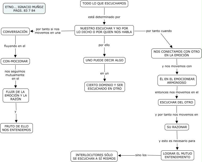 Este Cmap, tiene información relacionada con: Todo lo que escuchamos, TODO LO QUE ESCUCHAMOS está determinado por NUESTRO ESCUCHAR Y NO POR LO DICHO O POR QUIEN NOS HABLA, UNO PUEDE DECIR ALGO en un CIERTO DOMINIO Y SER ESCUCHADO EN OTRO, FLUIR DE LA EMOCIÓN Y LA RAZÓN y FRUTO DE ELLO NOS ENTENDEMOS, NUESTRO ESCUCHAR Y NO POR LO DICHO O POR QUIEN NOS HABLA por ello UNO PUEDE DECIR ALGO, LOGRAR EL MUTUO ENTENDIMIENTO sino los INTERLOCUTORES SÓLO SE ESCUCHAN A SÍ MISMOS, SU RAZONAR y esto es necesario para LOGRAR EL MUTUO ENTENDIMIENTO, NUESTRO ESCUCHAR Y NO POR LO DICHO O POR QUIEN NOS HABLA por tanto cuando NOS CONECTAMOS CON OTRO EN LA EMOCIÓN, NUESTRO ESCUCHAR Y NO POR LO DICHO O POR QUIEN NOS HABLA por tanto si nos movemos en una CONVERSACIÓN, CONVERSACIÓN fluyendo en el CON-MOCIONAR, ESCUCHAR DEL OTRO y por tanto nos movemos en SU RAZONAR, NOS CONECTAMOS CON OTRO EN LA EMOCIÓN y nos movemos con ÉL EN EL EMOCIONEAR ARMONIOSO, CON-MOCIONAR nos seguimos mutuamente en el FLUIR DE LA EMOCIÓN Y LA RAZÓN, ÉL EN EL EMOCIONEAR ARMONIOSO entonces nos movemos en el ESCUCHAR DEL OTRO