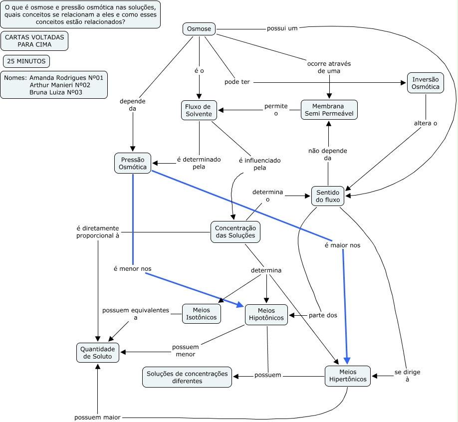 This Concept Map, created with IHMC CmapTools, has information related to: Osmose e pressão osmótica Amanda, Arthur, Bruna 3A, Fluxo de Solvente é determinado pela Pressão Osmótica, Meios Isotônicos possuem equivalentes a Quantidade de Soluto, Concentração das Soluções determina Meios Hipertônicos, Osmose possui um Sentido do fluxo, Concentração das Soluções determina o Sentido do fluxo, Concentração das Soluções determina Meios Hipotônicos, Meios Hipotônicos possuem Soluções de concentrações diferentes, Fluxo de Solvente é influenciado pela Concentração das Soluções, Osmose depende da Pressão Osmótica, Meios Hipertônicos possuem Soluções de concentrações diferentes, Concentração das Soluções é diretamente proporcional à Quantidade de Soluto, Osmose pode ter Inversão Osmótica, Meios Hipotônicos possuem menor Quantidade de Soluto, Osmose é o Fluxo de Solvente, Sentido do fluxo se dirige à Meios Hipertônicos, Sentido do fluxo parte dos Meios Hipotônicos, Pressão Osmótica é menor nos Meios Hipotônicos, Meios Hipertônicos possuem maior Quantidade de Soluto, Concentração das Soluções determina Meios Isotônicos, Osmose ocorre através de uma Membrana Semi Permeável