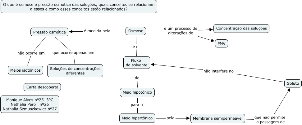 This Concept Map, created with IHMC CmapTools, has information related to: osmose monique, nathália e nathalia 3c, Meio hipertônico pela Membrana semipermeável, Pressão osmótica que ocorre apenas em Soluções de concentrações diferentes, Osmose é o Fluxo de solvente, Fluxo de solvente do Meio hipotônico, Soluto não interfere no Fluxo de solvente, Membrana semipermeável que não permite a passagem de Soluto, Osmose é um processo de alterações de PMV, Meio hipotônico para o Meio hipertônico, Osmose é um processo de alterações de Concentração das soluções, Pressão osmótica não ocorre em Meios isotônicos, Osmose é medida pela Pressão osmótica