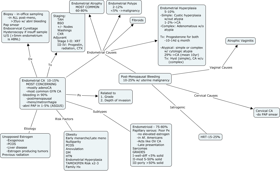 This Concept Map, created with IHMC CmapTools, has information related to: Postmenopausal Bleeding, Post-Menopausal Bleeding 10-25% w/ uterine malignancy Endometrial Causes Endometrial Atrophy MOST COMMON 60-80%, Post-Menopausal Bleeding 10-25% w/ uterine malignancy Endometrial Causes Endometrial CA 10-15% MOST CONCERNING -mostly adenoCA -most common GYN CA -bleeding in 90% -postmenopausal -meno/metrorrhagia -abnl PAP in 1-5% (ASGUS), Endometrial CA 10-15% MOST CONCERNING -mostly adenoCA -most common GYN CA -bleeding in 90% -postmenopausal -meno/metrorrhagia -abnl PAP in 1-5% (ASGUS) Px Related to 1. Grade 2. Depth of invasion, Endometrial CA 10-15% MOST CONCERNING -mostly adenoCA -most common GYN CA -bleeding in 90% -postmenopausal -meno/metrorrhagia -abnl PAP in 1-5% (ASGUS) Etiology Unopposed Estrogen -Exogenous -PCOS -Liver disease -Estrogen producing tumors Previous radiation, Post-Menopausal Bleeding 10-25% w/ uterine malignancy Vaginal Causes Atrophic Vaginitis, Post-Menopausal Bleeding 10-25% w/ uterine malignancy Cervical Causes Cervical CA -do PAP smear, Endometrial CA 10-15% MOST CONCERNING -mostly adenoCA -most common GYN CA -bleeding in 90% -postmenopausal -meno/metrorrhagia -abnl PAP in 1-5% (ASGUS) Dx Biopsy - in-office sampling -in ALL post-meno, ᡛyo w/ abnl bleeding Pap smear Endocervical Curettage Hysteroscopy if insuff sample U/S (ɱmm endometrium is ABNL), Post-Menopausal Bleeding 10-25% w/ uterine malignancy Endometrial Causes Fibroids, Post-Menopausal Bleeding 10-25% w/ uterine malignancy Iatrogenic HRT-15-25%, Endometrial CA 10-15% MOST CONCERNING -mostly adenoCA -most common GYN CA -bleeding in 90% -postmenopausal -meno/metrorrhagia -abnl PAP in 1-5% (ASGUS) Tx Staging: TAH BSO +/- Nodes Washings CXR Adjuvant Stage I-II: XRT III-IV: Progestin, radiation, CTX, Post-Menopausal Bleeding 10-25% w/ uterine malignancy Endometrial Causes Endometrial Hyperplasia 5-10% -Simple: Cystic hyperplasia w/out atypia 1-2%->CA -Complex: Adenomatous w/o atypia Tx: Progesterone for both -10-14d q month -Atypical: simple or complex w/ cytologic atypia 29%->CA (mean 10yr) Tx: Hyst (simple), CA w/u (complex), Endometrial CA 10-15% MOST CONCERNING -mostly adenoCA -most common GYN CA -bleeding in 90% -postmenopausal -meno/metrorrhagia -abnl PAP in 1-5% (ASGUS) Subtypes Endometrioid - 75-80% Papillary serous: Poor Px -no elevated estrogen -in Af. Americans -Acts like OV CA -Late presentation Sarcomas GRADES I-well-diff ɝ% solid II-mod 5-50% solid III-porly ᡪ% solid, Endometrial CA 10-15% MOST CONCERNING -mostly adenoCA -most common GYN CA -bleeding in 90% -postmenopausal -meno/metrorrhagia -abnl PAP in 1-5% (ASGUS) Risk Factors Obesity Early menarche/Late meno Nulliparity PCOS Anovulation DM HTN Endometrial Hyperplasia TAMOXIFEN Risk x2-3 Family Hx, Post-Menopausal Bleeding 10-25% w/ uterine malignancy Endometrial Causes Endometrial Polyps 2-12% ɝ% ->malignancy