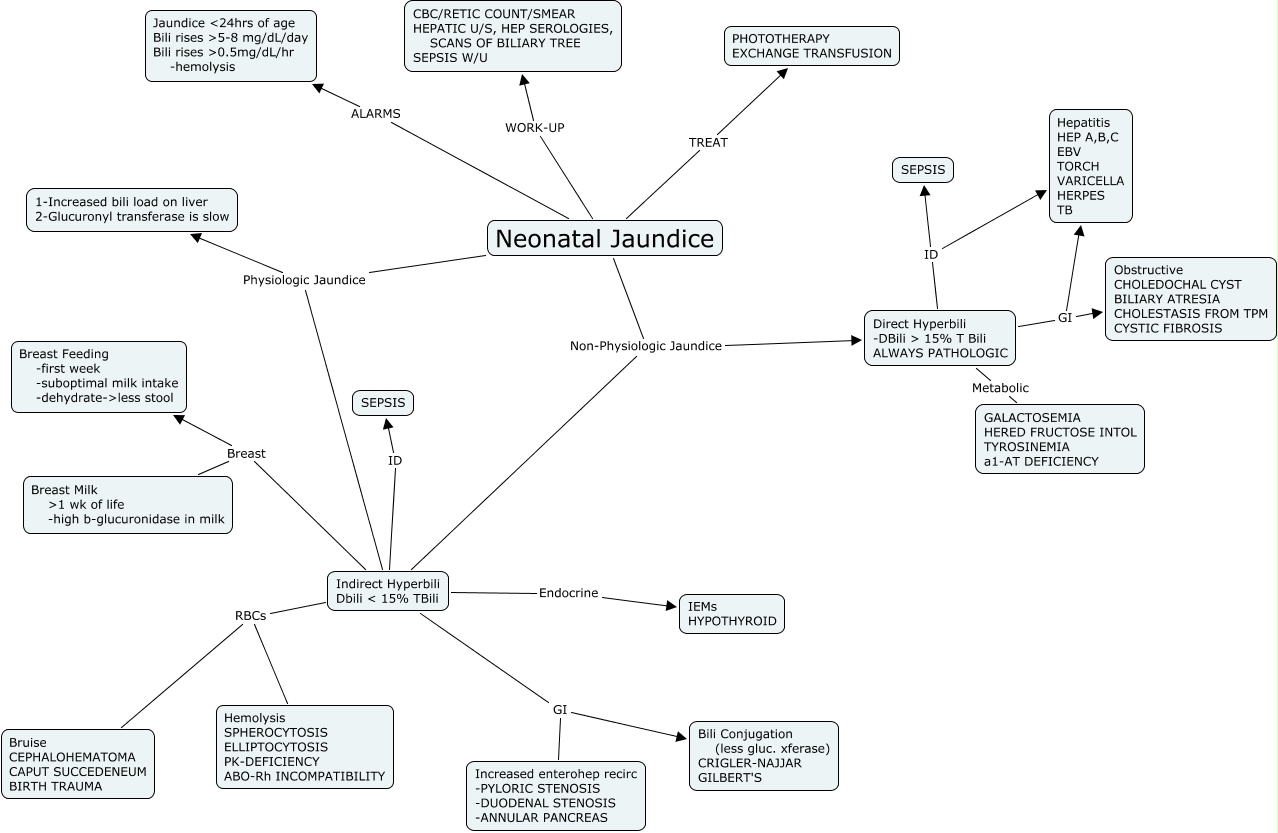 This Concept Map, created with IHMC CmapTools, has information related to: Neonatal Jaundice, Indirect Hyperbili Dbili < 15% TBili GI Increased enterohep recirc -PYLORIC STENOSIS -DUODENAL STENOSIS -ANNULAR PANCREAS, Indirect Hyperbili Dbili < 15% TBili GI Bili Conjugation (less gluc. xferase) CRIGLER-NAJJAR GILBERT'S, Direct Hyperbili -DBili > 15% T Bili ALWAYS PATHOLOGIC ID Hepatitis HEP A,B,C EBV TORCH VARICELLA HERPES TB, Neonatal Jaundice ALARMS Jaundice ឈhrs of age Bili rises ɱ-8 mg/dL/day Bili rises ɬ.5mg/dL/hr -hemolysis, Indirect Hyperbili Dbili < 15% TBili Breast Breast Milk ɭ wk of life -high b-glucuronidase in milk, Indirect Hyperbili Dbili < 15% TBili Physiologic Jaundice 1-Increased bili load on liver 2-Glucuronyl transferase is slow, Indirect Hyperbili Dbili < 15% TBili RBCs Bruise CEPHALOHEMATOMA CAPUT SUCCEDENEUM BIRTH TRAUMA, Neonatal Jaundice Non-Physiologic Jaundice Indirect Hyperbili Dbili < 15% TBili, Neonatal Jaundice WORK-UP CBC/RETIC COUNT/SMEAR HEPATIC U/S, HEP SEROLOGIES, SCANS OF BILIARY TREE SEPSIS W/U, Indirect Hyperbili Dbili < 15% TBili RBCs Hemolysis SPHEROCYTOSIS ELLIPTOCYTOSIS PK-DEFICIENCY ABO-Rh INCOMPATIBILITY, Neonatal Jaundice TREAT PHOTOTHERAPY EXCHANGE TRANSFUSION, Direct Hyperbili -DBili > 15% T Bili ALWAYS PATHOLOGIC GI Obstructive CHOLEDOCHAL CYST BILIARY ATRESIA CHOLESTASIS FROM TPM CYSTIC FIBROSIS, Indirect Hyperbili Dbili < 15% TBili Endocrine IEMs HYPOTHYROID, Indirect Hyperbili Dbili < 15% TBili Breast Breast Feeding -first week -suboptimal milk intake -dehydrate->less stool, Direct Hyperbili -DBili > 15% T Bili ALWAYS PATHOLOGIC Metabolic GALACTOSEMIA HERED FRUCTOSE INTOL TYROSINEMIA a1-AT DEFICIENCY, Neonatal Jaundice Physiologic Jaundice 1-Increased bili load on liver 2-Glucuronyl transferase is slow, Direct Hyperbili -DBili > 15% T Bili ALWAYS PATHOLOGIC ID SEPSIS, Indirect Hyperbili Dbili < 15% TBili ID SEPSIS, Neonatal Jaundice Non-Physiologic Jaundice Direct Hyperbili -DBili > 15% T Bili ALWAYS PATHOLOGIC, Direct Hyperbili -DBili > 15% T Bili ALWAYS PATHOLOGIC GI Hepatitis HEP A,B,C EBV TORCH VARICELLA HERPES TB