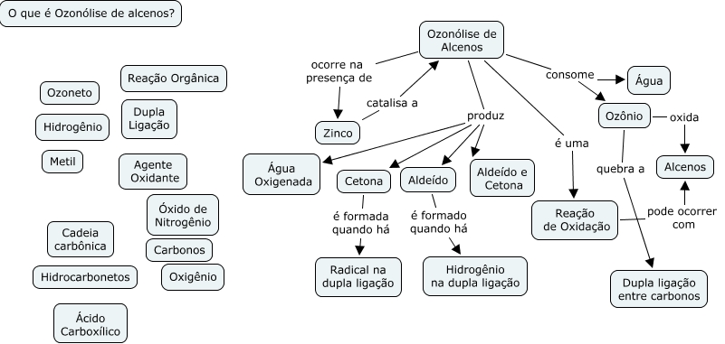 Esse mapa conceitual, produzido no IHMC CmapTools, tem a informação relacionada a: Ozonólise 3A, Reação de Oxidação pode ocorrer com Alcenos, Ozonólise de Alcenos é uma Reação de Oxidação, Zinco catalisa a Ozonólise de Alcenos, Ozonólise de Alcenos ocorre na presença de Zinco, Cetona é formada quando há Radical na dupla ligação, Ozonólise de Alcenos produz Água Oxigenada, Aldeído é formado quando há Hidrogênio na dupla ligação, Ozonólise de Alcenos produz Cetona, Ozonólise de Alcenos produz Aldeído e Cetona, Ozonólise de Alcenos consome Água, Ozônio oxida Alcenos, Ozonólise de Alcenos produz Aldeído, Ozônio quebra a Dupla ligação entre carbonos, Ozonólise de Alcenos consome Ozônio