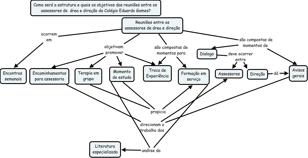 Esse mapa conceitual, produzido no IHMC CmapTools, tem a informação relacionada a: Assessoria, Terapia em grupo propicia Formação em serviço, Direção dá Avisos gerais, Reuniões entre os assessores de área e direção são compostas de momentos de Dialogo, Avisos gerais direcionam o trabalho dos Assessores, Reuniões entre os assessores de área e direção objetivam promover Momento de estudo, Reuniões entre os assessores de área e direção são compostas de momentos para Formação em serviço, Reuniões entre os assessores de área e direção são compostas de momentos para Troca de Experiência, Formação em serviço análise da Literatura especializada, Encaminhamentos para assessoria direcionam o trabalho dos Assessores, Momento de estudo propicia Formação em serviço, Reuniões entre os assessores de área e direção objetivam promover Encaminhamentos para assessoria, Reuniões entre os assessores de área e direção objetivam promover Terapia em grupo, Reuniões entre os assessores de área e direção objetivam promover Troca de Experiência, Momento de estudo análise da Literatura especializada, Reuniões entre os assessores de área e direção são compostas de momentos de Avisos gerais, Dialogo deve ocorrer entre Direção, Dialogo deve ocorrer entre Assessores, Reuniões entre os assessores de área e direção ocorrem em Encontros semanais