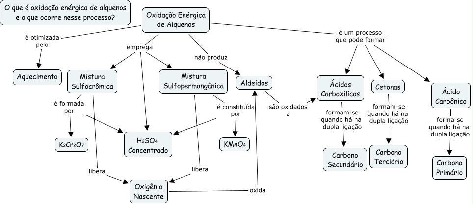 Esse mapa conceitual, produzido no IHMC CmapTools, tem a informação relacionada a: Oxidação Enérgica, Mistura Sulfopermangânica é constituída por H2SO4 Concentrado, Oxidação Enérgica de Alquenos é um processo que pode formar Ácidos Carboxílicos, Mistura Sulfocrômica libera Oxigênio Nascente, Oxidação Enérgica de Alquenos emprega Mistura Sulfopermangânica, Oxigênio Nascente oxida Aldeídos, Oxidação Enérgica de Alquenos emprega Mistura Sulfocrômica, Mistura Sulfopermangânica é constituída por KMnO4, Ácido Carbônico forma-se quando há na dupla ligação Carbono Primário, Mistura Sulfocrômica é formada por H2SO4 Concentrado, Mistura Sulfocrômica é formada por K2Cr2O7, Aldeídos são oxidados a Ácidos Carboxílicos, Cetonas formam-se quando há na dupla ligação Carbono Terciário, Ácidos Carboxílicos formam-se quando há na dupla ligação Carbono Secundário, Mistura Sulfopermangânica libera Oxigênio Nascente, Oxidação Enérgica de Alquenos emprega H2SO4 Concentrado, Oxidação Enérgica de Alquenos é um processo que pode formar Ácido Carbônico, Oxidação Enérgica de Alquenos é um processo que pode formar Cetonas, Oxidação Enérgica de Alquenos é otimizada pelo Aquecimento, Oxidação Enérgica de Alquenos não produz Aldeídos