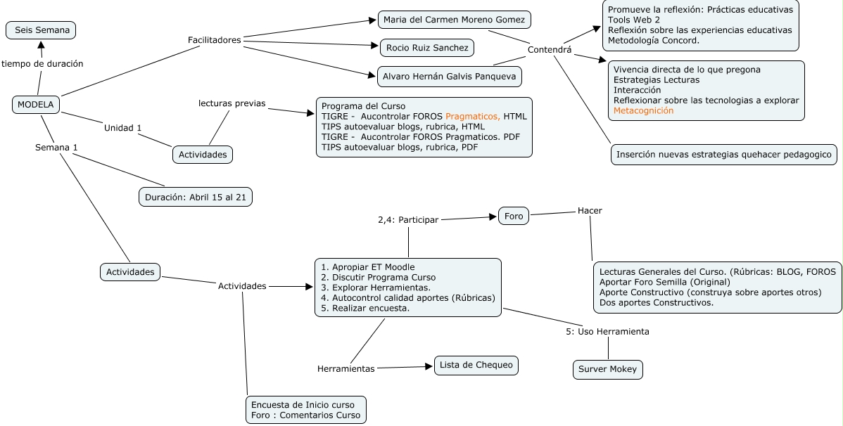 Este Cmap, tiene información relacionada con: Curso MODELA, Actividades Actividades Encuesta de Inicio curso Foro : Comentarios Curso, Maria del Carmen Moreno Gomez Contendrá Inserción nuevas estrategias quehacer pedagogico, Maria del Carmen Moreno Gomez Contendrá Vivencia directa de lo que pregona Estrategias Lecturas Interacción Reflexionar sobre las tecnologias a explorar Metacognición, Maria del Carmen Moreno Gomez Contendrá Promueve la reflexión: Prácticas educativas Tools Web 2 Reflexión sobre las experiencias educativas Metodología Concord., MODELA tiempo de duración Seis Semana, MODELA Semana 1 Actividades, Foro Hacer Lecturas Generales del Curso. (Rúbricas: BLOG, FOROS Aportar Foro Semilla (Original) Aporte Constructivo (construya sobre aportes otros) Dos aportes Constructivos., MODELA Semana 1 Duración: Abril 15 al 21, Actividades lecturas previas Programa del Curso TIGRE - Aucontrolar FOROS Pragmaticos, HTML TIPS autoevaluar blogs, rubrica, HTML TIGRE - Aucontrolar FOROS Pragmaticos. PDF TIPS autoevaluar blogs, rubrica, PDF, MODELA Facilitadores Rocio Ruiz Sanchez, Actividades Actividades 1. Apropiar ET Moodle 2. Discutir Programa Curso 3. Explorar Herramientas. 4. Autocontrol calidad aportes (Rúbricas) 5. Realizar encuesta., 1. Apropiar ET Moodle 2. Discutir Programa Curso 3. Explorar Herramientas. 4. Autocontrol calidad aportes (Rúbricas) 5. Realizar encuesta. 2,4: Participar Foro, MODELA Facilitadores Alvaro Hernán Galvis Panqueva, 1. Apropiar ET Moodle 2. Discutir Programa Curso 3. Explorar Herramientas. 4. Autocontrol calidad aportes (Rúbricas) 5. Realizar encuesta. 5: Uso Herramienta Surver Mokey, MODELA Unidad 1 Actividades, Alvaro Hernán Galvis Panqueva Contendrá Promueve la reflexión: Prácticas educativas Tools Web 2 Reflexión sobre las experiencias educativas Metodología Concord., MODELA Facilitadores Maria del Carmen Moreno Gomez, 1. Apropiar ET Moodle 2. Discutir Programa Curso 3. Explorar Herramientas. 4. Autocontrol calidad aportes (Rúbricas) 5. Realizar encuesta. Herramientas Lista de Chequeo, Alvaro Hernán Galvis Panqueva Contendrá Vivencia directa de lo que pregona Estrategias Lecturas Interacción Reflexionar sobre las tecnologias a explorar Metacognición, Alvaro Hernán Galvis Panqueva Contendrá Inserción nuevas estrategias quehacer pedagogico