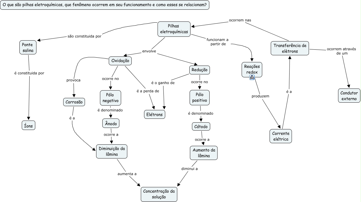 This Concept Map, created with IHMC CmapTools, has information related to: Pilha 2°B, Oxidação ocorre no Pólo negativo, Pólo positivo é denominado Cátodo, Pólo negativo é denominado Ânodo, Diminuição da lâmina aumenta a Concentração da solução, Oxidação provoca Corrosão, Cátodo ocorre a Aumento da lâmina, Pilhas eletroquímicas envolve Oxidação, Redução ocorre no Pólo positivo, Ânodo ocorre a Diminuição da lâmina, Transferência de elètrons ocorrem nas Pilhas eletroquímicas, Pilhas eletroquímicas funcionam a partir de Reações redox, Corrosão é a Diminuição da lâmina, Redução é o ganho de Elétrons, Ponte salina é constituida por Íons, Reações redox produzem Corrente elétrica, Transferência de elètrons ocorrem através de um Condutor externo, Aumento da lâmina diminui a Concentração da solução, Pilhas eletroquímicas são constituida por Ponte salina, Corrente elétrica é a Transferência de elètrons, Pilhas eletroquímicas envolve Redução