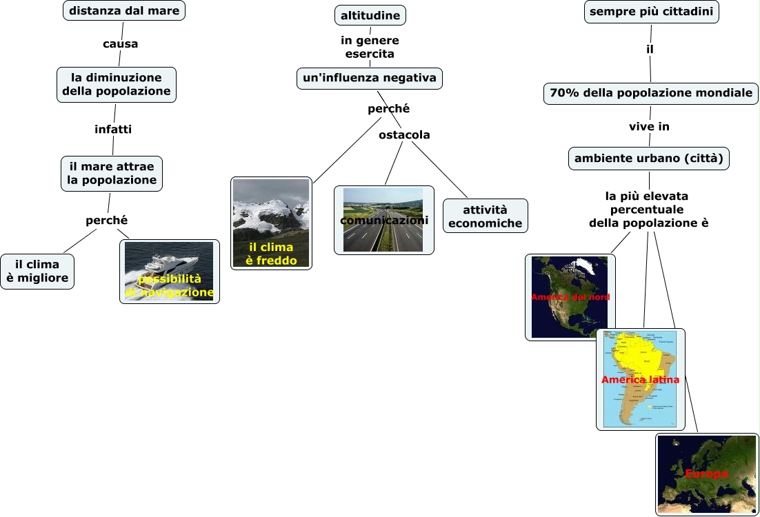 distanza dal mare e altitudine, il mare attrae la popolazione perché possibilità di navigazione, ambiente urbano (città) la più elevata percentuale della popolazione è Europa, ambiente urbano (città) la più elevata percentuale della popolazione è America latina, 70% della popolazione mondiale vive in ambiente urbano (città), distanza dal mare causa la diminuzione della popolazione, ambiente urbano (città) la più elevata percentuale della popolazione è America del nord, la diminuzione della popolazione infatti il mare attrae la popolazione, un'influenza negativa ostacola attività economiche, altitudine in genere esercita un'influenza negativa, il mare attrae la popolazione perché il clima è migliore