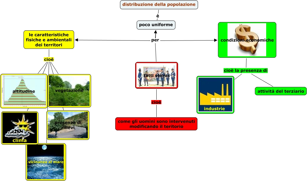 distribuzione popolazione, fatti storici cioè come gli uomini sono intervenuti modificando il teritorio, le caratteristiche fisiche e ambientali dei territori cioè vegetazione, poco uniforme per fatti storici, le caratteristiche fisiche e ambientali dei territori cioè vicinanza al mare, le caratteristiche fisiche e ambientali dei territori cioè altitudine, poco uniforme per condizioni economiche, distribuzione della popolazione è poco uniforme, condizioni economiche cioè la presenza di industrie, le caratteristiche fisiche e ambientali dei territori cioè presenza di rilievi, condizioni economiche cioè la presenza di attività del terziario