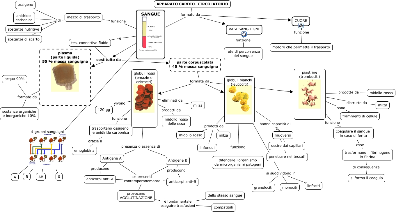 Questa Cmap, creata con IHMC CmapTools, contiene informazioni relative a: il_sangue, provocano AGGLUTINAZIONE se presenti contemporanemante Antigene A, parte corpuscolata 45 % massa sanguigna formata da piastrine (trombociti), APPARATO CARDIO- CIRCOLATORIO formato da VASI SANGUIGNI, SANGUE costituito da parte corpuscolata 45 % massa sanguigna, globuli bianchi (leucociti) prodotti da linfonodi, SANGUE funzione mezzo di trasporto, globuli bianchi (leucociti) funzione difendere l'organismo da microrganismi patogeni, globuli bianchi (leucociti) si suddividono in monociti, tes. connettivo fluido costituito da parte corpuscolata 45 % massa sanguigna, globuli bianchi (leucociti) si suddividono in linfociti, anticorpi anti-A se presenti contemporanemante Antigene A, globuli bianchi (leucociti) hanno capacità di uscire dai capillari, plasma (parte liquida) 55 % massa sanguigna formato da sostanze organiche e inorganiche 10%, SANGUE costituito da plasma (parte liquida) 55 % massa sanguigna, globuli rossi (emazie o eritrociti) funzione trasportano ossigeno e anidiride carbonica, globuli rossi (emazie o eritrociti) vivono 120 gg, mezzo di trasporto di sostanze di scarto, anticorpi anti-B se presenti contemporanemante Antigene A, globuli bianchi (leucociti) prodotti da milza, globuli bianchi (leucociti) prodotti da midollo rosso