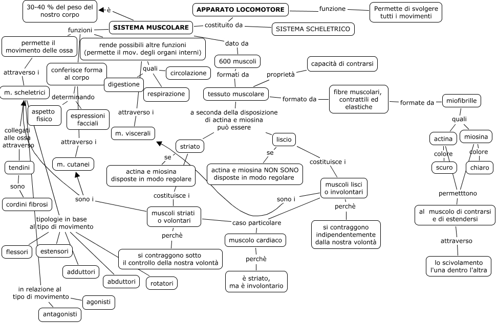 Questa Cmap, creata con IHMC CmapTools, contiene informazioni relative a: sistema_muscolare, tendini sono cordini fibrosi, miofibrille quali actina, muscoli lisci o involontari caso particolare muscolo cardiaco, rende possibili altre funzioni (permette il mov. degli organi interni) quali circolazione, muscoli striati o volontari caso particolare muscolo cardiaco, SISTEMA MUSCOLARE dato da 600 muscoli, m. scheletrici tipologie in base al tipo di movimento estensori, actina colore scuro, miosina colore chiaro, m. scheletrici tipologie in base al tipo di movimento adduttori, conferisce forma al corpo determinando aspetto fisico, liscio costituisce i muscoli lisci o involontari, miosina permetttono al muscolo di contrarsi e di estendersi, striato costituisce i muscoli striati o volontari, SISTEMA MUSCOLARE funzioni permette il movimento delle ossa, rende possibili altre funzioni (permette il mov. degli organi interni) attraverso i m. viscerali, APPARATO LOCOMOTORE costituito da SISTEMA MUSCOLARE, SISTEMA MUSCOLARE funzioni conferisce forma al corpo, al muscolo di contrarsi e di estendersi attraverso lo scivolamento l'una dentro l'altra, muscoli lisci o involontari perchè si contraggono indipendentemente dalla nostra volontà