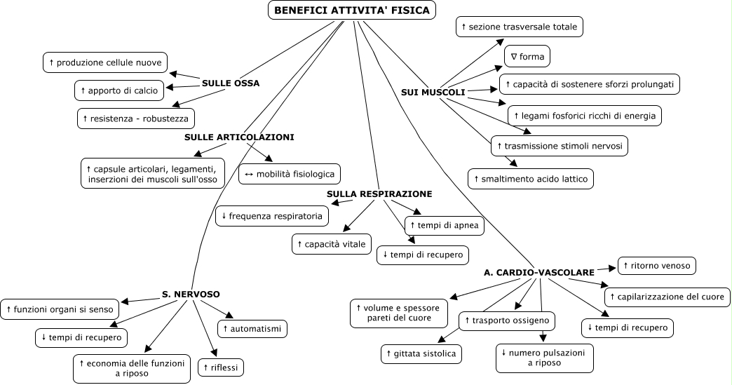 Questa Cmap, creata con IHMC CmapTools, contiene informazioni relative a: benefici attività fisica, BENEFICI ATTIVITA' FISICA SULLA RESPIRAZIONE ↑ tempi di apnea, BENEFICI ATTIVITA' FISICA SULLA RESPIRAZIONE ↓ frequenza respiratoria, BENEFICI ATTIVITA' FISICA SULLE ARTICOLAZIONI ↑ capsule articolari, legamenti, inserzioni dei muscoli sull'osso, BENEFICI ATTIVITA' FISICA SULLE OSSA ↑ apporto di calcio, BENEFICI ATTIVITA' FISICA S. NERVOSO ↑ economia delle funzioni a riposo, BENEFICI ATTIVITA' FISICA SUI MUSCOLI ↑ legami fosforici ricchi di energia, BENEFICI ATTIVITA' FISICA SULLA RESPIRAZIONE ↑ capacità vitale, BENEFICI ATTIVITA' FISICA SUI MUSCOLI ↑ trasmissione stimoli nervosi, BENEFICI ATTIVITA' FISICA A. CARDIO-VASCOLARE ↑ capilarizzazione del cuore, BENEFICI ATTIVITA' FISICA SUI MUSCOLI ↑ sezione trasversale totale, BENEFICI ATTIVITA' FISICA S. NERVOSO ↑ riflessi, BENEFICI ATTIVITA' FISICA A. CARDIO-VASCOLARE ↓ tempi di recupero, BENEFICI ATTIVITA' FISICA SULLE OSSA ↑ resistenza - robustezza, BENEFICI ATTIVITA' FISICA SUI MUSCOLI ↑ capacità di sostenere sforzi prolungati, BENEFICI ATTIVITA' FISICA SUI MUSCOLI ↑ smaltimento acido lattico, BENEFICI ATTIVITA' FISICA SUI MUSCOLI ∇ forma, BENEFICI ATTIVITA' FISICA A. CARDIO-VASCOLARE ↑ gittata sistolica, BENEFICI ATTIVITA' FISICA S. NERVOSO ↑ automatismi, BENEFICI ATTIVITA' FISICA SULLE ARTICOLAZIONI ↔ mobilità fisiologica, BENEFICI ATTIVITA' FISICA S. NERVOSO ↓ tempi di recupero