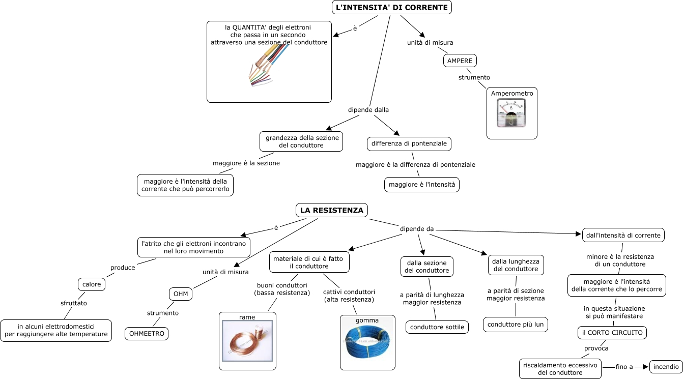 Questa Cmap, creata con IHMC CmapTools, contiene informazioni relative a: intensità corrente-resistenza, LA RESISTENZA dipende da materiale di cui è fatto il conduttore, riscaldamento eccessivo del conduttore fino a incendio, calore sfruttato in alcuni elettrodomestici per raggiungere alte temperature, LA RESISTENZA è l'atrito che gli elettroni incontrano nel loro movimento, differenza di pontenziale maggiore è la differenza di pontenziale maggiore è l'intensità, L'INTENSITA' DI CORRENTE unità di misura AMPERE, materiale di cui è fatto il conduttore buoni conduttori (bassa resistenza) rame, grandezza della sezione del conduttore maggiore è la sezione maggiore è l'intensità della corrente che può percorrerlo, dalla lunghezza del conduttore a parità di sezione maggior resistenza conduttore più lun, LA RESISTENZA unità di misura OHM, LA RESISTENZA dipende da dall'intensità di corrente, AMPERE strumento Amperometro, l'atrito che gli elettroni incontrano nel loro movimento produce calore, LA RESISTENZA dipende da dalla lunghezza del conduttore, dall'intensità di corrente minore è la resistenza di un conduttore maggiore è l'intensità della corrente che lo percorre, L'INTENSITA' DI CORRENTE dipende dalla differenza di pontenziale, maggiore è l'intensità della corrente che lo percorre in questa situazione si può manifestare il CORTO CIRCUITO, L'INTENSITA' DI CORRENTE dipende dalla grandezza della sezione del conduttore, LA RESISTENZA dipende da dalla sezione del conduttore, dalla sezione del conduttore a parità di lunghezza maggior resistenza conduttore sottile