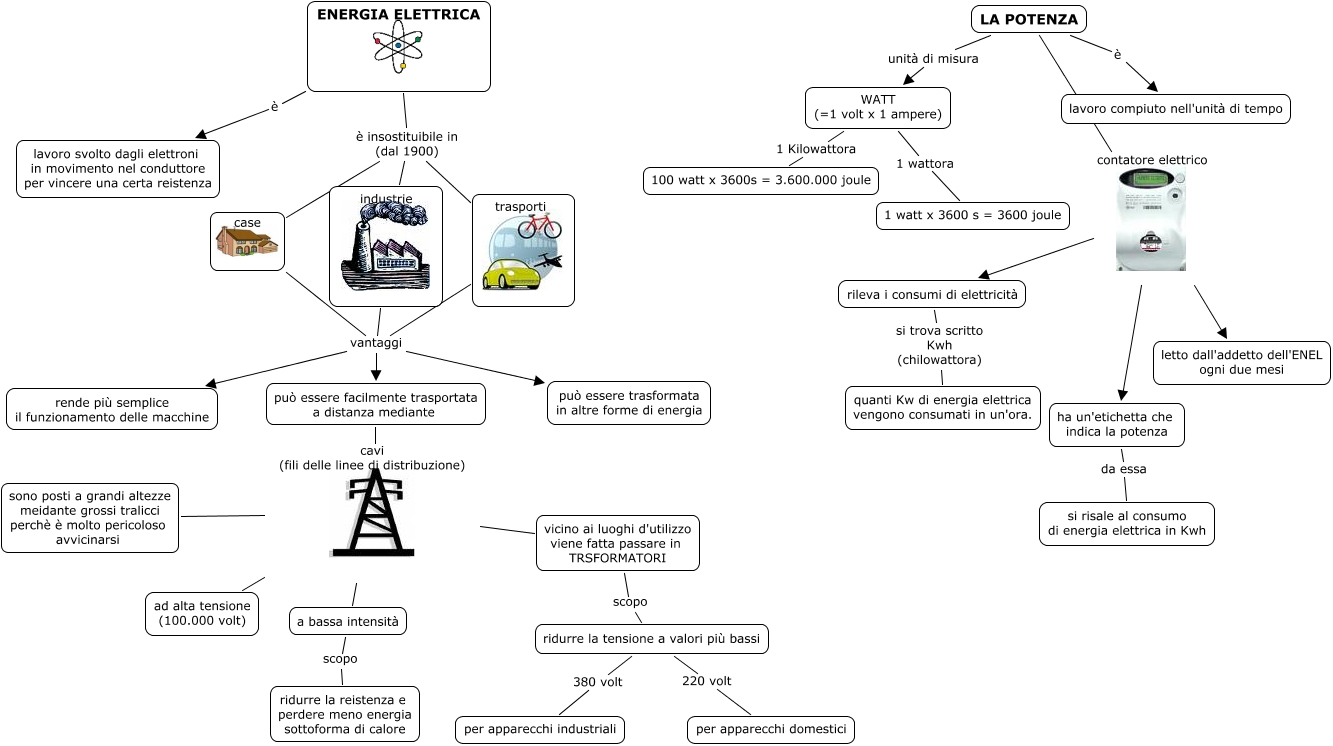 Questa Cmap, creata con IHMC CmapTools, contiene informazioni relative a: energia elettrica - potenza, ENERGIA ELETTRICA è lavoro svolto dagli elettroni in movimento nel conduttore per vincere una certa reistenza, trasporti vantaggi può essere facilmente trasportata a distanza mediante, ha un'etichetta che indica la potenza da essa si risale al consumo di energia elettrica in Kwh, ENERGIA ELETTRICA è insostituibile in (dal 1900) industrie, può essere facilmente trasportata a distanza mediante cavi (fili delle linee di distribuzione) ad alta tensione (100.000 volt), trasporti vantaggi rende più semplice il funzionamento delle macchine, ridurre la tensione a valori più bassi 380 volt per apparecchi industriali, industrie vantaggi può essere facilmente trasportata a distanza mediante, WATT (=1 volt x 1 ampere) 1 Kilowattora 100 watt x 3600s = 3.600.000 joule, WATT (=1 volt x 1 ampere) 1 wattora 1 watt x 3600 s = 3600 joule, LA POTENZA unità di misura WATT (=1 volt x 1 ampere), LA POTENZA contatore elettrico ha un'etichetta che indica la potenza, rileva i consumi di elettricità si trova scritto Kwh (chilowattora) quanti Kw di energia elettrica vengono consumati in un'ora., può essere facilmente trasportata a distanza mediante cavi (fili delle linee di distribuzione) vicino ai luoghi d'utilizzo viene fatta passare in TRSFORMATORI, case vantaggi può essere facilmente trasportata a distanza mediante, ENERGIA ELETTRICA è insostituibile in (dal 1900) trasporti, ridurre la tensione a valori più bassi 220 volt per apparecchi domestici, a bassa intensità scopo ridurre la reistenza e perdere meno energia sottoforma di calore, industrie vantaggi rende più semplice il funzionamento delle macchine, LA POTENZA contatore elettrico rileva i consumi di elettricità