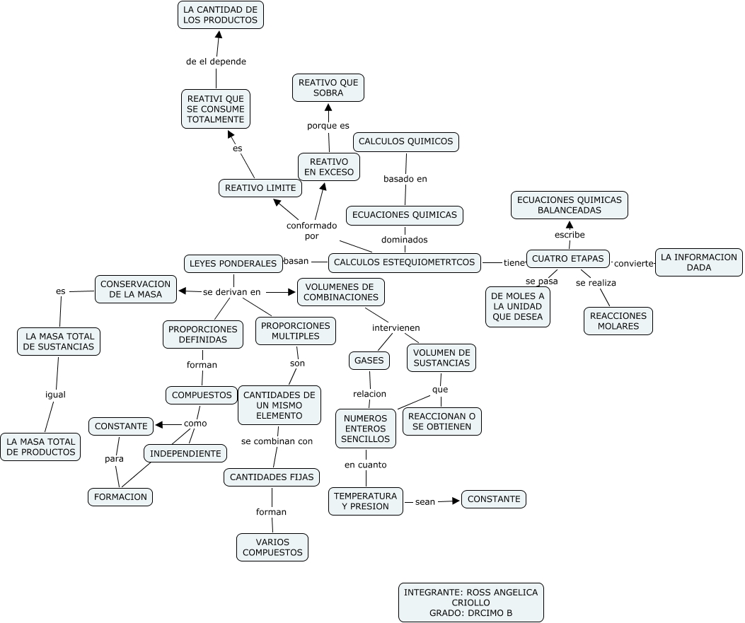 Este Cmap, tiene información relacionada con: CALCULOS QUIMICOS ross, CALCULOS ESTEQUIOMETRTCOS conformado por REATIVO EN EXCESO, CUATRO ETAPAS convierte LA INFORMACION DADA, VOLUMEN DE SUSTANCIAS que NUMEROS ENTEROS SENCILLOS, VOLUMENES DE COMBINACIONES intervienen GASES, REATIVI QUE SE CONSUME TOTALMENTE de el depende LA CANTIDAD DE LOS PRODUCTOS, COMPUESTOS como INDEPENDIENTE, ECUACIONES QUIMICAS dominados CALCULOS ESTEQUIOMETRTCOS, PROPORCIONES DEFINIDAS forman COMPUESTOS, CANTIDADES FIJAS forman VARIOS COMPUESTOS, CALCULOS ESTEQUIOMETRTCOS conformado por REATIVO LIMITE, VOLUMENES DE COMBINACIONES intervienen VOLUMEN DE SUSTANCIAS, NUMEROS ENTEROS SENCILLOS en cuanto TEMPERATURA Y PRESION, CALCULOS QUIMICOS basado en ECUACIONES QUIMICAS, LA MASA TOTAL DE SUSTANCIAS igual LA MASA TOTAL DE PRODUCTOS, CUATRO ETAPAS escribe ECUACIONES QUIMICAS BALANCEADAS, LEYES PONDERALES se derivan en PROPORCIONES MULTIPLES, LEYES PONDERALES se derivan en CONSERVACION DE LA MASA, CALCULOS ESTEQUIOMETRTCOS se basan LEYES PONDERALES, CONSERVACION DE LA MASA es LA MASA TOTAL DE SUSTANCIAS, VOLUMEN DE SUSTANCIAS que REACCIONAN O SE OBTIENEN