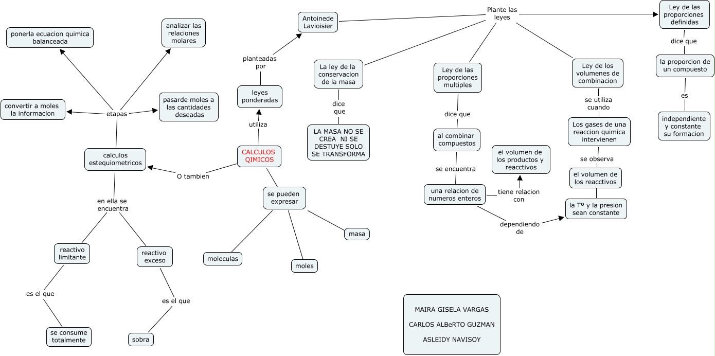 Este Cmap, tiene información relacionada con: calculo Quimikos carguz, calculos estequiometricos etapas pasarde moles a las cantidades deseadas, se pueden expresar ???? moles, Ley de las proporciones multiples dice que al combinar compuestos, CALCULOS QIMICOS O tambien calculos estequiometricos, Antoinede Lavioisier Plante las leyes Ley de las proporciones definidas, el volumen de los reacctivos ???? la Tº y la presion sean constante, Antoinede Lavioisier Plante las leyes Ley de las proporciones multiples, CALCULOS QIMICOS utiliza leyes ponderadas, al combinar compuestos se encuentra una relacion de numeros enteros, La ley de la conservacion de la masa dice que LA MASA NO SE CREA NI SE DESTUYE SOLO SE TRANSFORMA, reactivo exceso es el que sobra, leyes ponderadas planteadas por Antoinede Lavioisier, la proporcion de un compuesto es independiente y constante su formacion, calculos estequiometricos en ella se encuentra reactivo exceso, una relacion de numeros enteros dependiendo de la Tº y la presion sean constante, Antoinede Lavioisier Plante las leyes La ley de la conservacion de la masa, Antoinede Lavioisier Plante las leyes Ley de los volumenes de combinacion, Los gases de una reaccion quimica intervienen se observa el volumen de los reacctivos, se pueden expresar ???? masa, se pueden expresar ???? moleculas