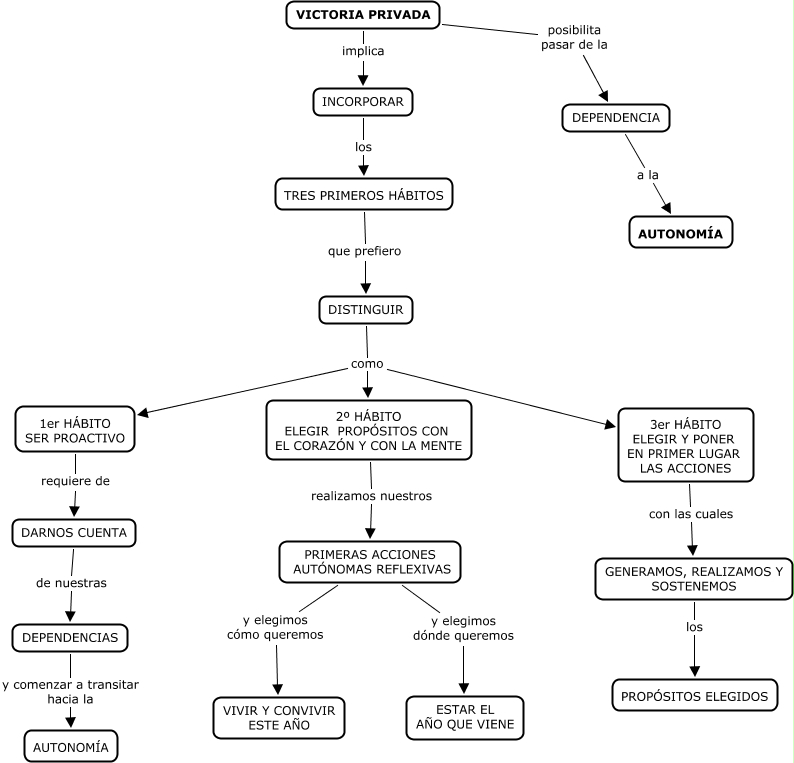 Este Cmap, tiene información relacionada con: Víctoria Privada, TRES PRIMEROS HÁBITOS que prefiero DISTINGUIR, VICTORIA PRIVADA implica INCORPORAR, DISTINGUIR como 3er HÁBITO ELEGIR Y PONER EN PRIMER LUGAR LAS ACCIONES, DEPENDENCIAS y comenzar a transitar hacia la AUTONOMÍA, 2º HÁBITO ELEGIR PROPÓSITOS CON EL CORAZÓN Y CON LA MENTE realizamos nuestros PRIMERAS ACCIONES AUTÓNOMAS REFLEXIVAS, DEPENDENCIA a la AUTONOMÍA, DISTINGUIR como 2º HÁBITO ELEGIR PROPÓSITOS CON EL CORAZÓN Y CON LA MENTE, DARNOS CUENTA de nuestras DEPENDENCIAS, 1er HÁBITO SER PROACTIVO requiere de DARNOS CUENTA, GENERAMOS, REALIZAMOS Y SOSTENEMOS los PROPÓSITOS ELEGIDOS, PRIMERAS ACCIONES AUTÓNOMAS REFLEXIVAS y elegimos dónde queremos ESTAR EL AÑO QUE VIENE, 3er HÁBITO ELEGIR Y PONER EN PRIMER LUGAR LAS ACCIONES con las cuales GENERAMOS, REALIZAMOS Y SOSTENEMOS, INCORPORAR los TRES PRIMEROS HÁBITOS, DISTINGUIR como 1er HÁBITO SER PROACTIVO, VICTORIA PRIVADA posibilita pasar de la DEPENDENCIA, PRIMERAS ACCIONES AUTÓNOMAS REFLEXIVAS y elegimos cómo queremos VIVIR Y CONVIVIR ESTE AÑO