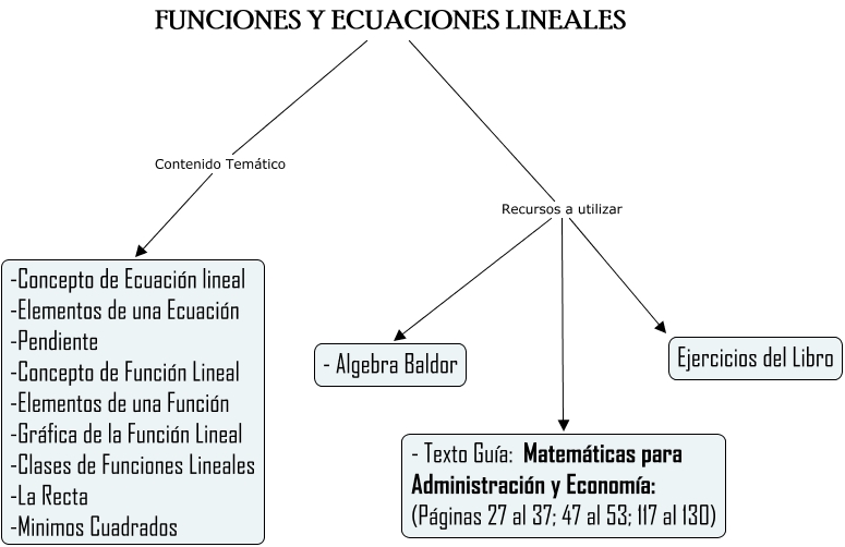 Este Cmap, tiene información relacionada con: Unidad 5 20101, FUNCIONES Y ECUACIONES LINEALES Recursos a utilizar - Algebra Baldor, FUNCIONES Y ECUACIONES LINEALES Recursos a utilizar - Texto Guía: Matemáticas para Administración y Economía: (Páginas 27 al 37; 47 al 53; 117 al 130), FUNCIONES Y ECUACIONES LINEALES Recursos a utilizar Ejercicios del Libro, FUNCIONES Y ECUACIONES LINEALES Contenido Temático -Concepto de Ecuación lineal -Elementos de una Ecuación -Pendiente -Concepto de Función Lineal -Elementos de una Función -Gráfica de la Función Lineal -Clases de Funciones Lineales -La Recta -Minimos Cuadrados