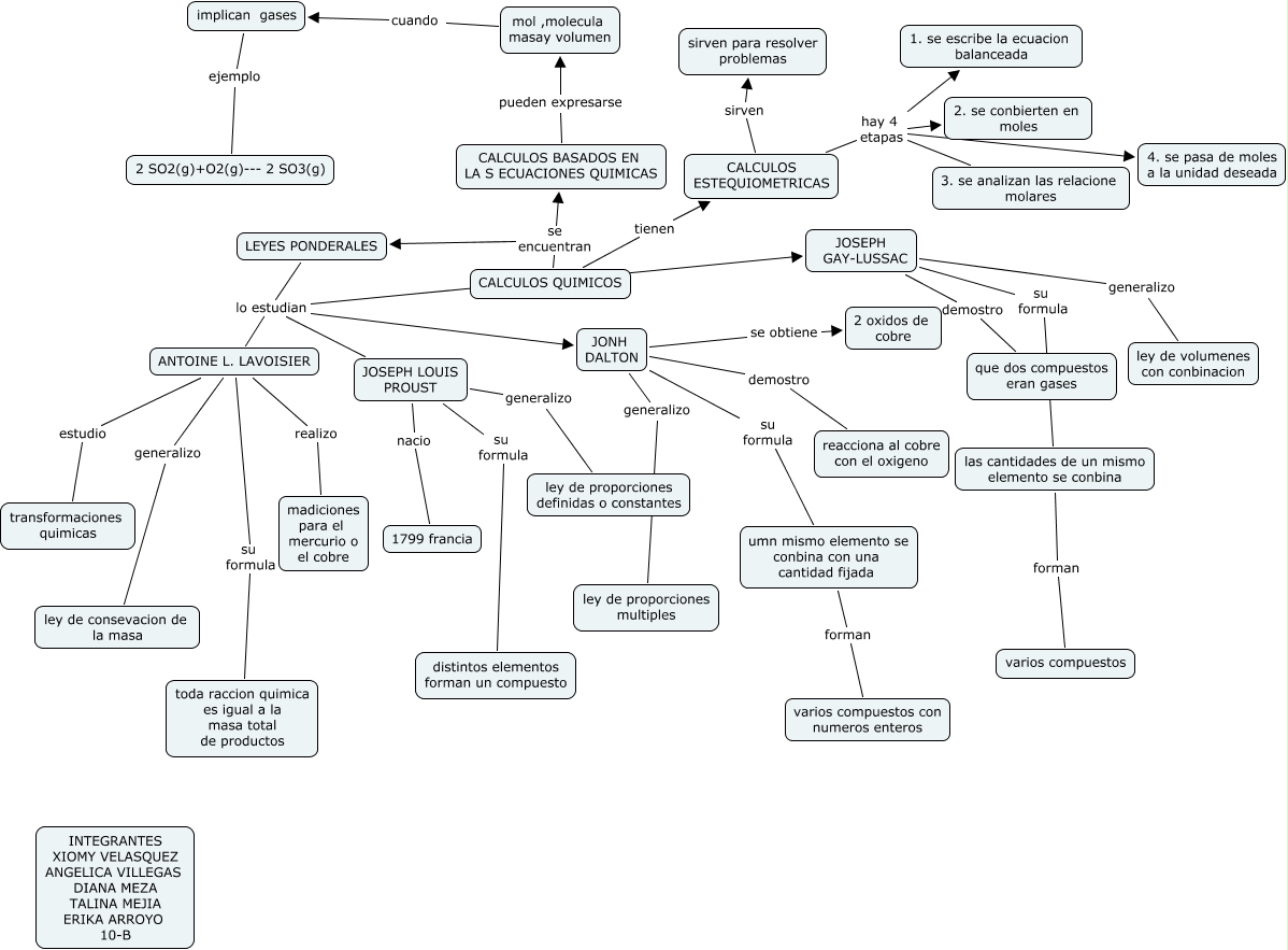 Este Cmap, tiene información relacionada con: xiomy CALCULOS QUIMICOS, ANTOINE L. LAVOISIER generalizo ley de consevacion de la masa, CALCULOS ESTEQUIOMETRICAS hay 4 etapas 3. se analizan las relacione molares, umn mismo elemento se conbina con una cantidad fijada forman varios compuestos con numeros enteros, JONH DALTON se obtiene 2 oxidos de cobre, ANTOINE L. LAVOISIER estudio transformaciones quimicas, mol ,molecula masay volumen cuando implican gases, JOSEPH LOUIS PROUST su formula distintos elementos forman un compuesto, JONH DALTON demostro reacciona al cobre con el oxigeno, JONH DALTON generalizo ley de proporciones multiples, LEYES PONDERALES lo estudian JOSEPH LOUIS PROUST, CALCULOS QUIMICOS se encuentran LEYES PONDERALES, JOSEPH LOUIS PROUST generalizo ley de proporciones definidas o constantes, implican gases ejemplo 2 SO2(g)+O2(g)--- 2 SO3(g), LEYES PONDERALES lo estudian JONH DALTON, ANTOINE L. LAVOISIER realizo madiciones para el mercurio o el cobre, LEYES PONDERALES lo estudian ANTOINE L. LAVOISIER, CALCULOS QUIMICOS se encuentran CALCULOS BASADOS EN LA S ECUACIONES QUIMICAS, las cantidades de un mismo elemento se conbina forman varios compuestos, CALCULOS ESTEQUIOMETRICAS hay 4 etapas 4. se pasa de moles a la unidad deseada, CALCULOS ESTEQUIOMETRICAS hay 4 etapas 1. se escribe la ecuacion balanceada