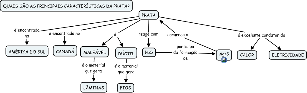Esse mapa conceitual, produzido no IHMC CmapTools, tem a informação relacionada a: PRATA, PRATA é encontrada no CANADÁ, Ag2S escurece a PRATA, PRATA é encontrada na AMÉRICA DO SUL, MALEÁVEL é o material que gera LÂMINAS, PRATA é DÚCTIL, DÚCTIL é o material que gera FIOS, PRATA é MALEÁVEL, PRATA é excelente condutor de CALOR, H2S participa da formação de Ag2S, PRATA é excelente condutor de ELETRICIDADE, PRATA reage com H2S