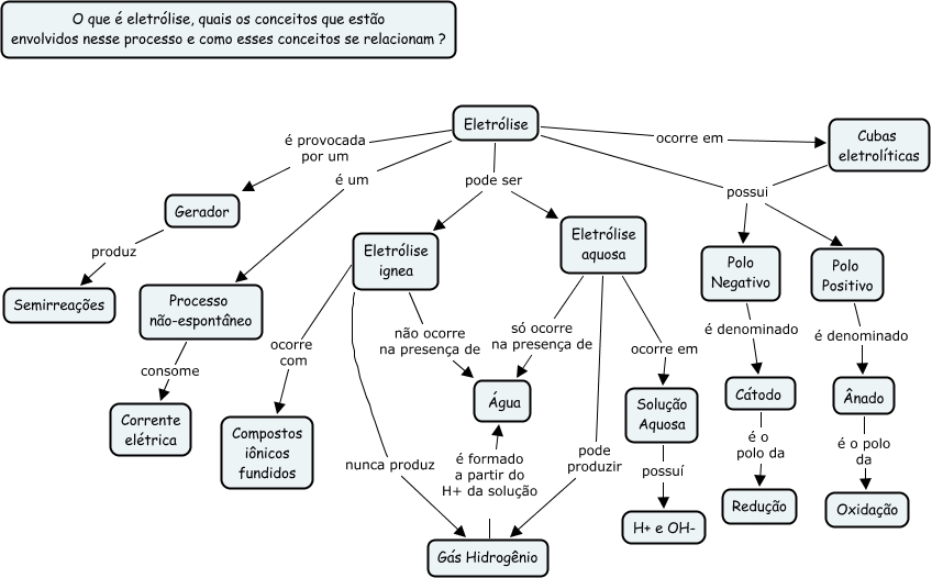 Esse mapa conceitual, produzido no IHMC CmapTools, tem a informação relacionada a: Eletrólise 2°B, Processo não-espontâneo consome Corrente elétrica, Eletrólise possui Polo Negativo, Eletrólise ocorre em Cubas eletrolíticas, Polo Positivo é denominado Ânado, Cátodo é o polo da Redução, Eletrólise ignea nunca produz Gás Hidrogênio, Eletrólise possui Polo Positivo, Eletrólise é provocada por um Gerador, Eletrólise pode ser Eletrólise aquosa, Eletrólise é um Processo não-espontâneo, Cubas eletrolíticas possui Polo Positivo, Solução Aquosa possuí H+ e OH-, Cubas eletrolíticas possui Polo Negativo, Gás Hidrogênio é formado a partir do H+ da solução Água, Eletrólise aquosa ocorre em Solução Aquosa, Eletrólise aquosa só ocorre na presença de Água, Ânado é o polo da Oxidação, Eletrólise pode ser Eletrólise ignea, Eletrólise ignea não ocorre na presença de Água, Eletrólise ignea ocorre com Compostos iônicos fundidos