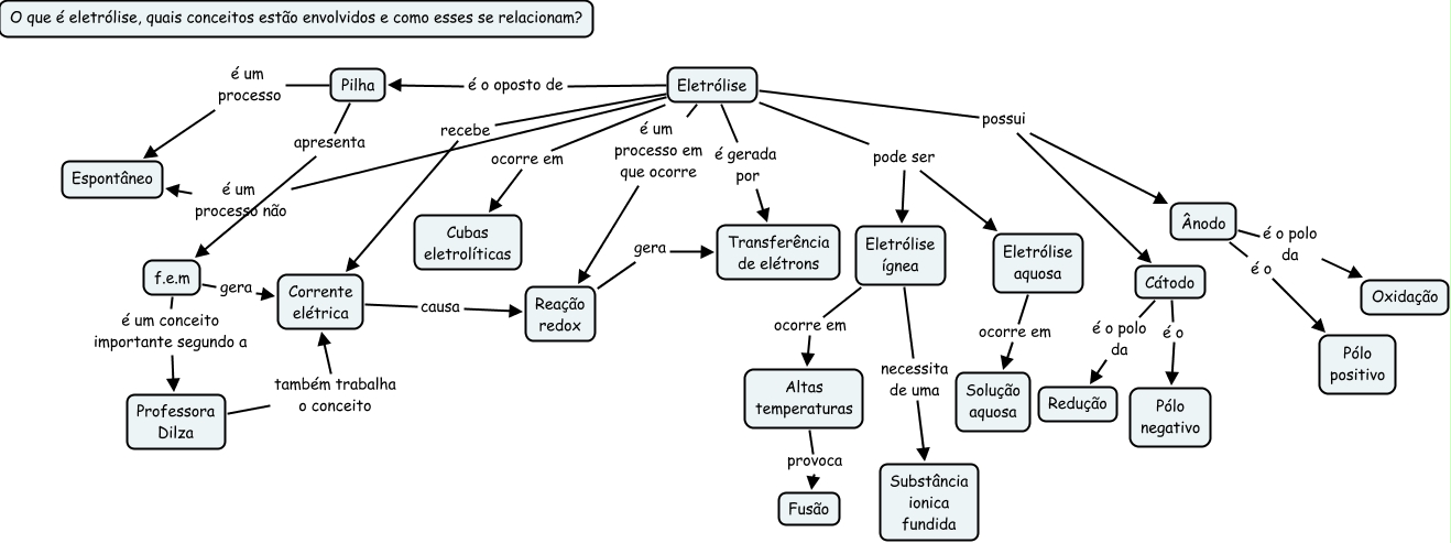Esse mapa conceitual, produzido no IHMC CmapTools, tem a informação relacionada a: Eletrólise 2°C, Cátodo é o Pólo negativo, Eletrólise é gerada por Transferência de elétrons, Pilha é um processo Espontâneo, Eletrólise ocorre em Cubas eletrolíticas, Eletrólise pode ser Eletrólise ígnea, Eletrólise pode ser Eletrólise aquosa, Ânodo é o Pólo positivo, Eletrólise recebe Corrente elétrica, Eletrólise é um processo em que ocorre Reação redox, Ânodo é o polo da Oxidação, Eletrólise é um processo não Espontâneo, Pilha apresenta f.e.m, Cátodo é o polo da Redução, Eletrólise é o oposto de Pilha, Corrente elétrica causa Reação redox, Reação redox gera Transferência de elétrons, Eletrólise ígnea necessita de uma Substância ionica fundida, Eletrólise possui Cátodo, Professora Dilza também trabalha o conceito Corrente elétrica, f.e.m é um conceito importante segundo a Professora Dilza
