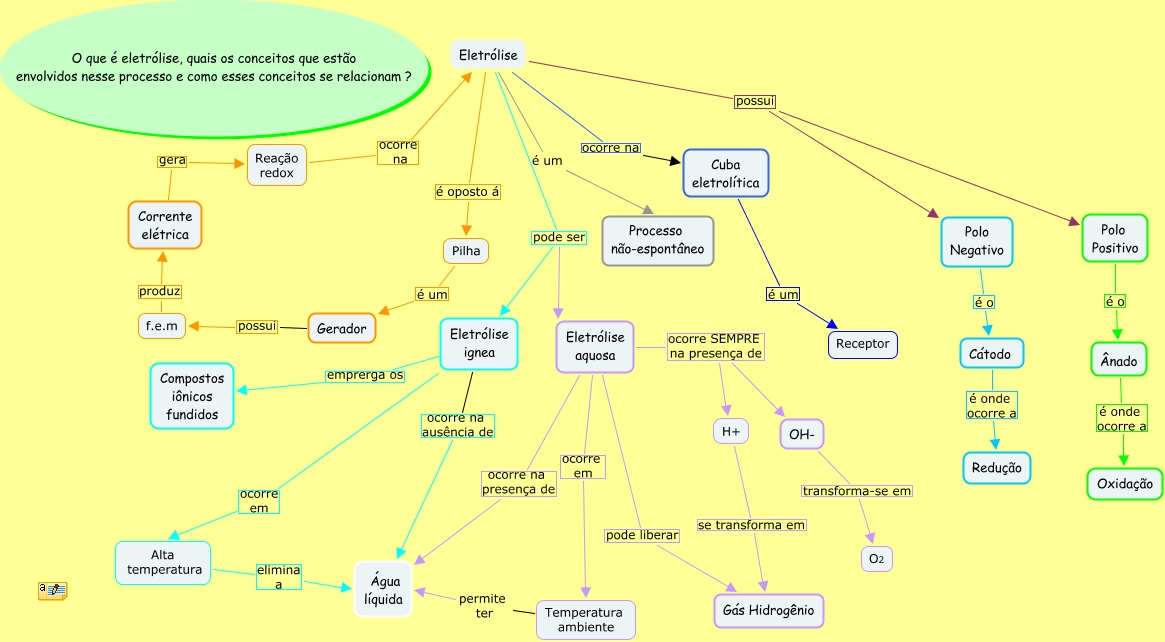 Esse mapa conceitual, produzido no IHMC CmapTools, tem a informação relacionada a: Eletrólise 2ºA, Eletrólise é um Processo não-espontâneo, Eletrólise ocorre na Cuba eletrolítica, Eletrólise aquosa pode liberar Gás Hidrogênio, Eletrólise ignea ocorre em Alta temperatura, OH- transforma-se em O2, Eletrólise aquosa ocorre na presença de Água líquida, Temperatura ambiente permite ter Água líquida, Eletrólise aquosa ocorre em Temperatura ambiente, Corrente elétrica gera Reação redox, H+ se transforma em Gás Hidrogênio, f.e.m produz Corrente elétrica, Cuba eletrolítica é um Receptor, Eletrólise pode ser Eletrólise ignea, Gerador possui f.e.m, Eletrólise possui Polo Negativo, Cátodo é onde ocorre a Redução, Eletrólise aquosa ocorre SEMPRE na presença de H+, Pilha é um Gerador, Eletrólise aquosa ocorre SEMPRE na presença de OH-, Eletrólise possui Polo Positivo