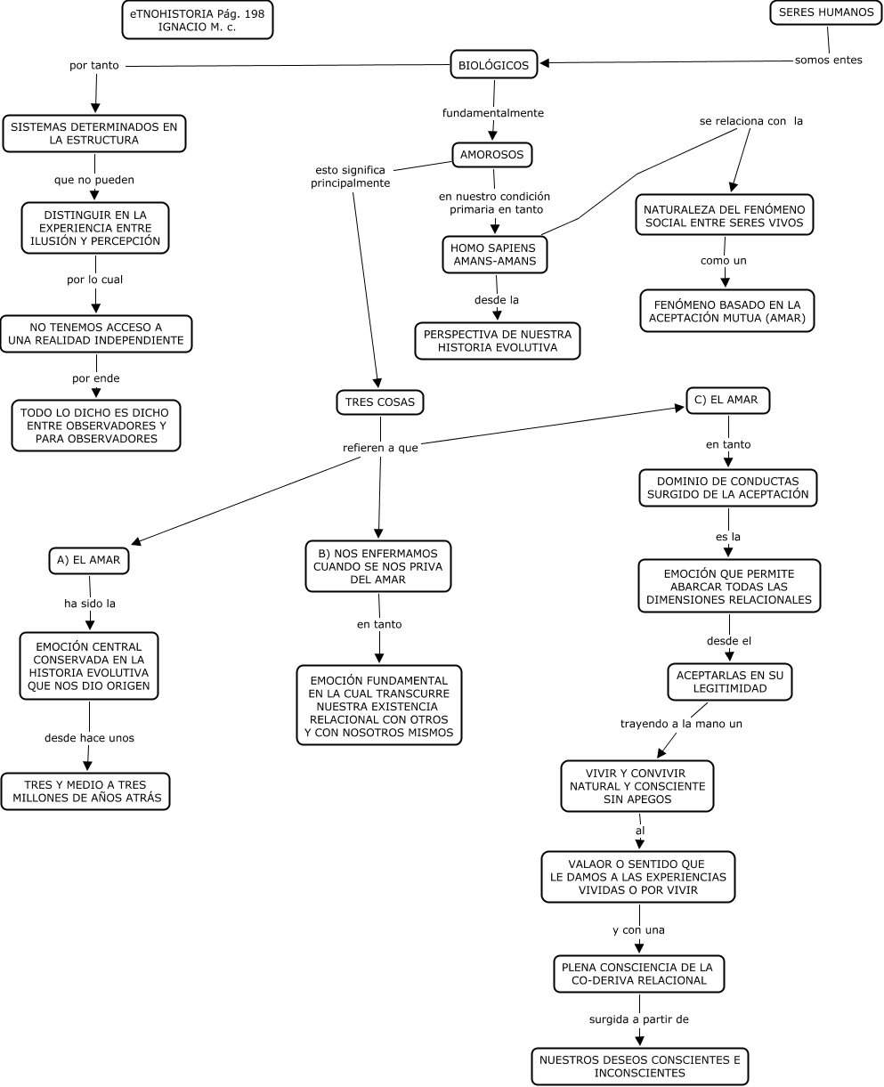 Este Cmap, tiene información relacionada con: SERES HUMANOS COMO ENTES BIOLÓGICOS, HOMO SAPIENS AMANS-AMANS se relaciona con la NATURALEZA DEL FENÓMENO SOCIAL ENTRE SERES VIVOS, BIOLÓGICOS por tanto SISTEMAS DETERMINADOS EN LA ESTRUCTURA, B) NOS ENFERMAMOS CUANDO SE NOS PRIVA DEL AMAR en tanto EMOCIÓN FUNDAMENTAL EN LA CUAL TRANSCURRE NUESTRA EXISTENCIA RELACIONAL CON OTROS Y CON NOSOTROS MISMOS, TRES COSAS refieren a que B) NOS ENFERMAMOS CUANDO SE NOS PRIVA DEL AMAR, BIOLÓGICOS fundamentalmente AMOROSOS, TRES COSAS refieren a que C) EL AMAR, VALAOR O SENTIDO QUE LE DAMOS A LAS EXPERIENCIAS VIVIDAS O POR VIVIR y con una PLENA CONSCIENCIA DE LA CO-DERIVA RELACIONAL, ACEPTARLAS EN SU LEGITIMIDAD trayendo a la mano un VIVIR Y CONVIVIR NATURAL Y CONSCIENTE SIN APEGOS, C) EL AMAR en tanto DOMINIO DE CONDUCTAS SURGIDO DE LA ACEPTACIÓN, DOMINIO DE CONDUCTAS SURGIDO DE LA ACEPTACIÓN es la EMOCIÓN QUE PERMITE ABARCAR TODAS LAS DIMENSIONES RELACIONALES, SISTEMAS DETERMINADOS EN LA ESTRUCTURA que no pueden DISTINGUIR EN LA EXPERIENCIA ENTRE ILUSIÓN Y PERCEPCIÓN, TRES COSAS refieren a que A) EL AMAR, DISTINGUIR EN LA EXPERIENCIA ENTRE ILUSIÓN Y PERCEPCIÓN por lo cual NO TENEMOS ACCESO A UNA REALIDAD INDEPENDIENTE, AMOROSOS esto significa principalmente TRES COSAS, PLENA CONSCIENCIA DE LA CO-DERIVA RELACIONAL surgida a partir de NUESTROS DESEOS CONSCIENTES E INCONSCIENTES, HOMO SAPIENS AMANS-AMANS desde la PERSPECTIVA DE NUESTRA HISTORIA EVOLUTIVA, VIVIR Y CONVIVIR NATURAL Y CONSCIENTE SIN APEGOS al VALAOR O SENTIDO QUE LE DAMOS A LAS EXPERIENCIAS VIVIDAS O POR VIVIR, EMOCIÓN QUE PERMITE ABARCAR TODAS LAS DIMENSIONES RELACIONALES desde el ACEPTARLAS EN SU LEGITIMIDAD, A) EL AMAR ha sido la EMOCIÓN CENTRAL CONSERVADA EN LA HISTORIA EVOLUTIVA QUE NOS DIO ORIGEN, NO TENEMOS ACCESO A UNA REALIDAD INDEPENDIENTE por ende TODO LO DICHO ES DICHO ENTRE OBSERVADORES Y PARA OBSERVADORES