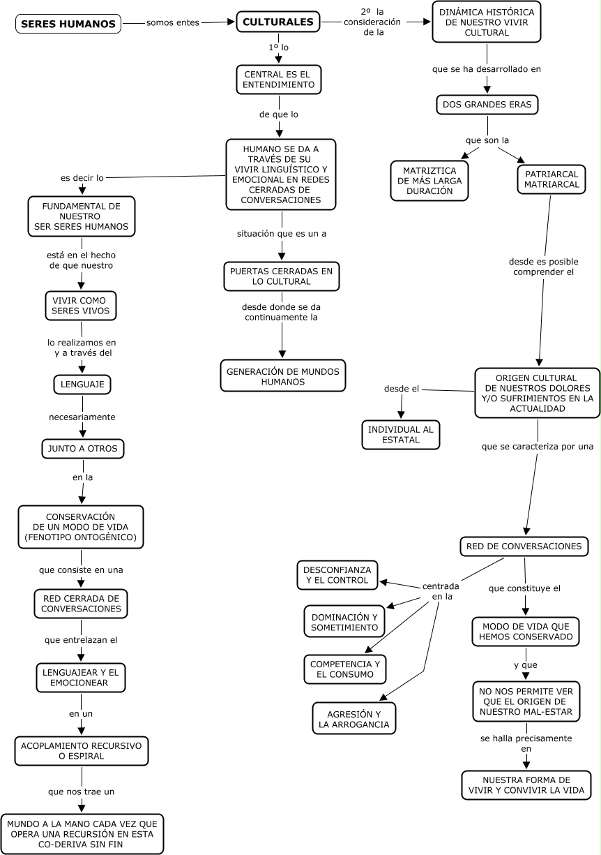Este Cmap, tiene información relacionada con: SERES HUMANOS COMO ENTES CULTURALES, MODO DE VIDA QUE HEMOS CONSERVADO y que NO NOS PERMITE VER QUE EL ORIGEN DE NUESTRO MAL-ESTAR, SERES HUMANOS somos entes CULTURALES, DINÁMICA HISTÓRICA DE NUESTRO VIVIR CULTURAL que se ha desarrollado en DOS GRANDES ERAS, ORIGEN CULTURAL DE NUESTROS DOLORES Y/O SUFRIMIENTOS EN LA ACTUALIDAD desde el INDIVIDUAL AL ESTATAL, DOS GRANDES ERAS que son la PATRIARCAL MATRIARCAL, CULTURALES 2º la consideración de la DINÁMICA HISTÓRICA DE NUESTRO VIVIR CULTURAL, JUNTO A OTROS en la CONSERVACIÓN DE UN MODO DE VIDA (FENOTIPO ONTOGÉNICO), RED CERRADA DE CONVERSACIONES que entrelazan el LENGUAJEAR Y EL EMOCIONEAR, LENGUAJE necesariamente JUNTO A OTROS, RED DE CONVERSACIONES centrada en la DOMINACIÓN Y SOMETIMIENTO, NO NOS PERMITE VER QUE EL ORIGEN DE NUESTRO MAL-ESTAR se halla precisamente en NUESTRA FORMA DE VIVIR Y CONVIVIR LA VIDA, RED DE CONVERSACIONES centrada en la AGRESIÓN Y LA ARROGANCIA, CONSERVACIÓN DE UN MODO DE VIDA (FENOTIPO ONTOGÉNICO) que consiste en una RED CERRADA DE CONVERSACIONES, HUMANO SE DA A TRAVÉS DE SU VIVIR LINGUÍSTICO Y EMOCIONAL EN REDES CERRADAS DE CONVERSACIONES es decir lo FUNDAMENTAL DE NUESTRO SER SERES HUMANOS, HUMANO SE DA A TRAVÉS DE SU VIVIR LINGUÍSTICO Y EMOCIONAL EN REDES CERRADAS DE CONVERSACIONES situación que es un a PUERTAS CERRADAS EN LO CULTURAL, PUERTAS CERRADAS EN LO CULTURAL desde donde se da continuamente la GENERACIÓN DE MUNDOS HUMANOS, ORIGEN CULTURAL DE NUESTROS DOLORES Y/O SUFRIMIENTOS EN LA ACTUALIDAD que se caracteriza por una RED DE CONVERSACIONES, RED DE CONVERSACIONES centrada en la COMPETENCIA Y EL CONSUMO, RED DE CONVERSACIONES que constituye el MODO DE VIDA QUE HEMOS CONSERVADO, FUNDAMENTAL DE NUESTRO SER SERES HUMANOS está en el hecho de que nuestro VIVIR COMO SERES VIVOS