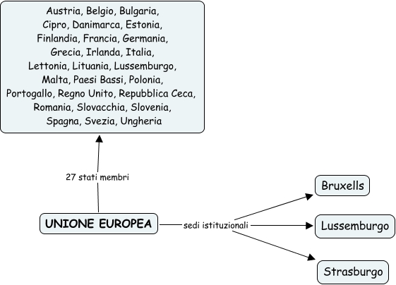 Questa Mappa Concettuale ha informazioni correlate a: Benedetta-UE, UNIONE EUROPEA sedi istituzionali Lussemburgo, UNIONE EUROPEA sedi istituzionali Strasburgo, UNIONE EUROPEA sedi istituzionali Bruxells, UNIONE EUROPEA 27 stati membri Austria, Belgio, Bulgaria, Cipro, Danimarca, Estonia, Finlandia, Francia, Germania, Grecia, Irlanda, Italia, Lettonia, Lituania, Lussemburgo, Malta, Paesi Bassi, Polonia, Portogallo, Regno Unito, Repubblica Ceca, Romania, Slovacchia, Slovenia, Spagna, Svezia, Ungheria