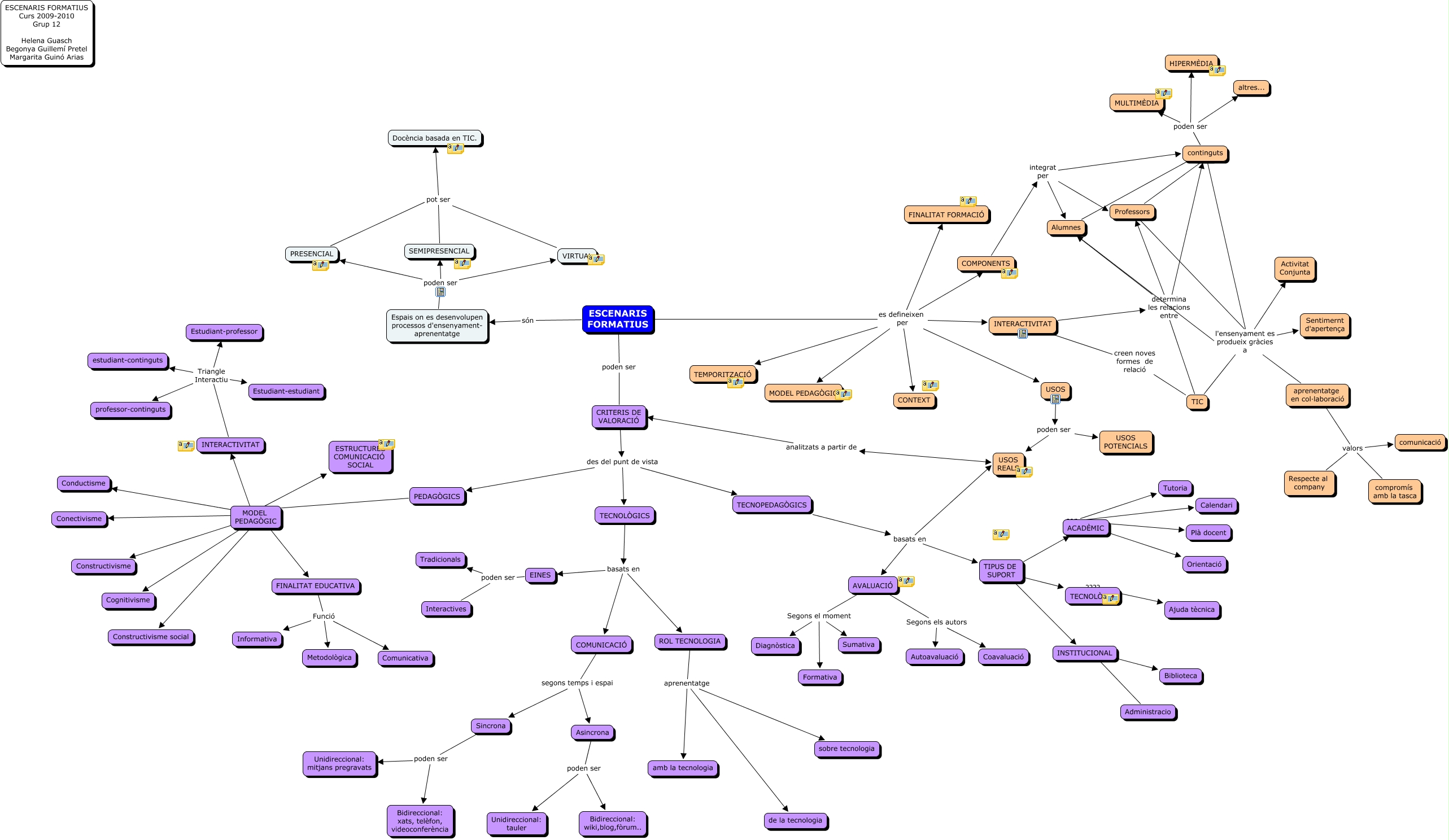Este Cmap, tiene información relacionada con: v3_marga, FINALITAT EDUCATIVA Funció Informativa, aprenentatge en col·laboració valors compromís amb la tasca, TIC l'ensenyament es produeix gràcies a Activitat Conjunta, continguts l'ensenyament es produeix gràcies a Sentimernt d'apertença, ROL TECNOLOGIA aprenentatge de la tecnologia, ROL TECNOLOGIA aprenentatge amb la tecnologia, continguts poden ser altres..., ESCENARIS FORMATIUS es defineixen per COMPONENTS, ACADÈMIC son Orientació, TIC determina les relacions entre Professors, PRESENCIAL pot ser Docència basada en TIC., ESCENARIS FORMATIUS poden ser CRITERIS DE VALORACIÓ, INSTITUCIONAL ???? Biblioteca, AVALUACIÓ Segons el moment Diagnòstica, TIC determina les relacions entre continguts, INTERACTIVITAT Triangle Interactiu Estudiant-professor, AVALUACIÓ Segons els autors Coavaluació, continguts poden ser MULTIMÈDIA, continguts poden ser HIPERMÈDIA, TIC l'ensenyament es produeix gràcies a aprenentatge en col·laboració
