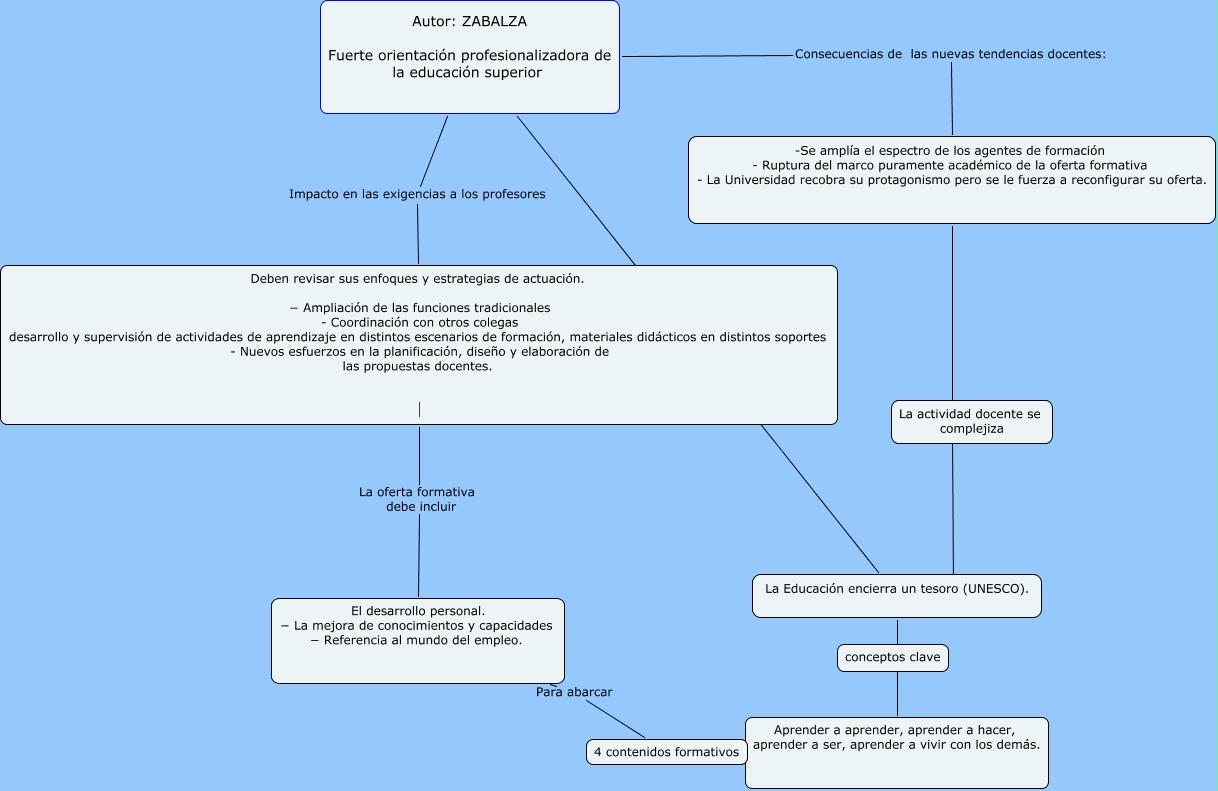 Este Cmap, tiene información relacionada con: Autores, Deben revisar sus enfoques y estrategias de actuación. − Ampliación de las funciones tradicionales - Coordinación con otros colegas desarrollo y supervisión de actividades de aprendizaje en distintos escenarios de formación, materiales didácticos en distintos soportes - Nuevos esfuerzos en la planificación, diseño y elaboración de las propuestas docentes. La oferta formativa debe incluir El desarrollo personal. − La mejora de conocimientos y capacidades − Referencia al mundo del empleo., Autor: ZABALZA Fuerte orientación profesionalizadora de la educación superior Consecuencias de las nuevas tendencias docentes: - Se amplía el espectro de los agentes de formación - Ruptura del marco puramente académico de la oferta formativa - La Universidad recobra su protagonismo pero se le fuerza a reconfigurar su oferta., El desarrollo personal. − La mejora de conocimientos y capacidades − Referencia al mundo del empleo. Para abarcar 4 contenidos formativos, La Educación encierra un tesoro (UNESCO). ???? Aprender a aprender, aprender a hacer, aprender a ser, aprender a vivir con los demás., - Se amplía el espectro de los agentes de formación - Ruptura del marco puramente académico de la oferta formativa - La Universidad recobra su protagonismo pero se le fuerza a reconfigurar su oferta. ???? Internacionalmente, Autor: ZABALZA Fuerte orientación profesionalizadora de la educación superior ???? La Educación encierra un tesoro (UNESCO)., Autor: ZABALZA Fuerte orientación profesionalizadora de la educación superior Impacto en las exigencias a los profesores Deben revisar sus enfoques y estrategias de actuación. − Ampliación de las funciones tradicionales - Coordinación con otros colegas desarrollo y supervisión de actividades de aprendizaje en distintos escenarios de formación, materiales didácticos en distintos soportes - Nuevos esfuerzos en la planificación, diseño y elaboración de las propuestas docentes.