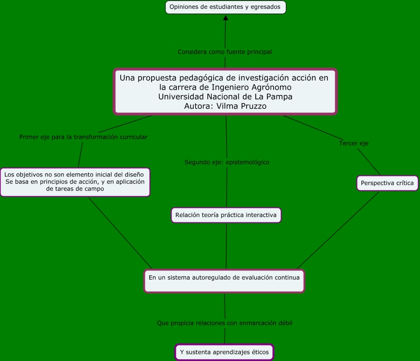 Este Cmap, tiene información relacionada con: Pruzzo, En un sistema autoregulado de evaluación continua Que propicia relaciones con enmarcación débil Y sustenta aprendizajes éticos, Perspectiva crítica ???? ????, Los objetivos no son elemento inicial del diseño Se basa en principios de acción, y en aplicación de tareas de campo ???? ????, Una propuesta pedagógica de investigación acción en la carrera de Ingeniero Agrónomo Universidad Nacional de La Pampa Autora: Vilma Pruzzo Tercer eje Perspectiva crítica, Relación teoría práctica interactiva ???? En un sistema autoregulado de evaluación continua, Una propuesta pedagógica de investigación acción en la carrera de Ingeniero Agrónomo Universidad Nacional de La Pampa Autora: Vilma Pruzzo Primer eje para la transformación curricular Los objetivos no son elemento inicial del diseño Se basa en principios de acción, y en aplicación de tareas de campo, Una propuesta pedagógica de investigación acción en la carrera de Ingeniero Agrónomo Universidad Nacional de La Pampa Autora: Vilma Pruzzo Segundo eje: epistemológico Relación teoría práctica interactiva, Una propuesta pedagógica de investigación acción en la carrera de Ingeniero Agrónomo Universidad Nacional de La Pampa Autora: Vilma Pruzzo Considera como fuente principal Opiniones de estudiantes y egresados