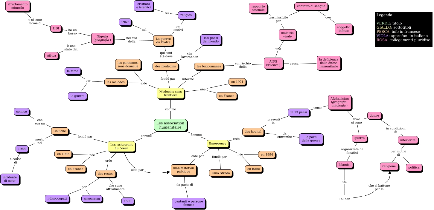 Questa Cmap, creata con IHMC CmapTools, contiene informazioni relative a: Associazioni umanitarie, Les association humanitaire comme Emergency, AIDS (scienze) una malattia virale, Medecins sans frontiere informe les toxicomanes, des restos crée Les restaurant du coeur, malattia virale trasmissibile per contatto di sangue, contatto di sangue con soggetto infetto, Nigeria (geografia) ha un basso HDI, inferiorità per motivi di religione, Les restaurant du coeur aide par manifestation publique, Afghanistan (geografia- antologia) dove ci sono guerra, inferiorità per motivi di politica, en 1971 née en France, des restos per i disoccupati, guerra organizzata da fanatici Islamici, La guerre du Biafra nel sud della Nigeria (geografia), La guerre du Biafra per motivi religiosi, Les restaurant du coeur fondé par Coluche, les malades per la guerra, 1500 che sono attualmente des restos, HDI e ci sono forme di sfruttamento minorile