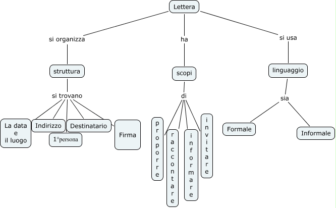 Questa Cmap, creata con IHMC CmapTools, contiene informazioni relative a: lettera, Lettera si organizza struttura, Lettera ha scopi, struttura si trovano La data e il luogo, linguaggio sia Informale, struttura si trovano Firma, struttura si trovano Indirizzo, scopi di p r o p o r r e, struttura si trovano Destinatario, scopi di r a c c o n t a r e, scopi di i n v i t a r e, Lettera si usa linguaggio, struttura si trovano 1°persona, scopi di i n f o r m a r e, linguaggio sia Formale
