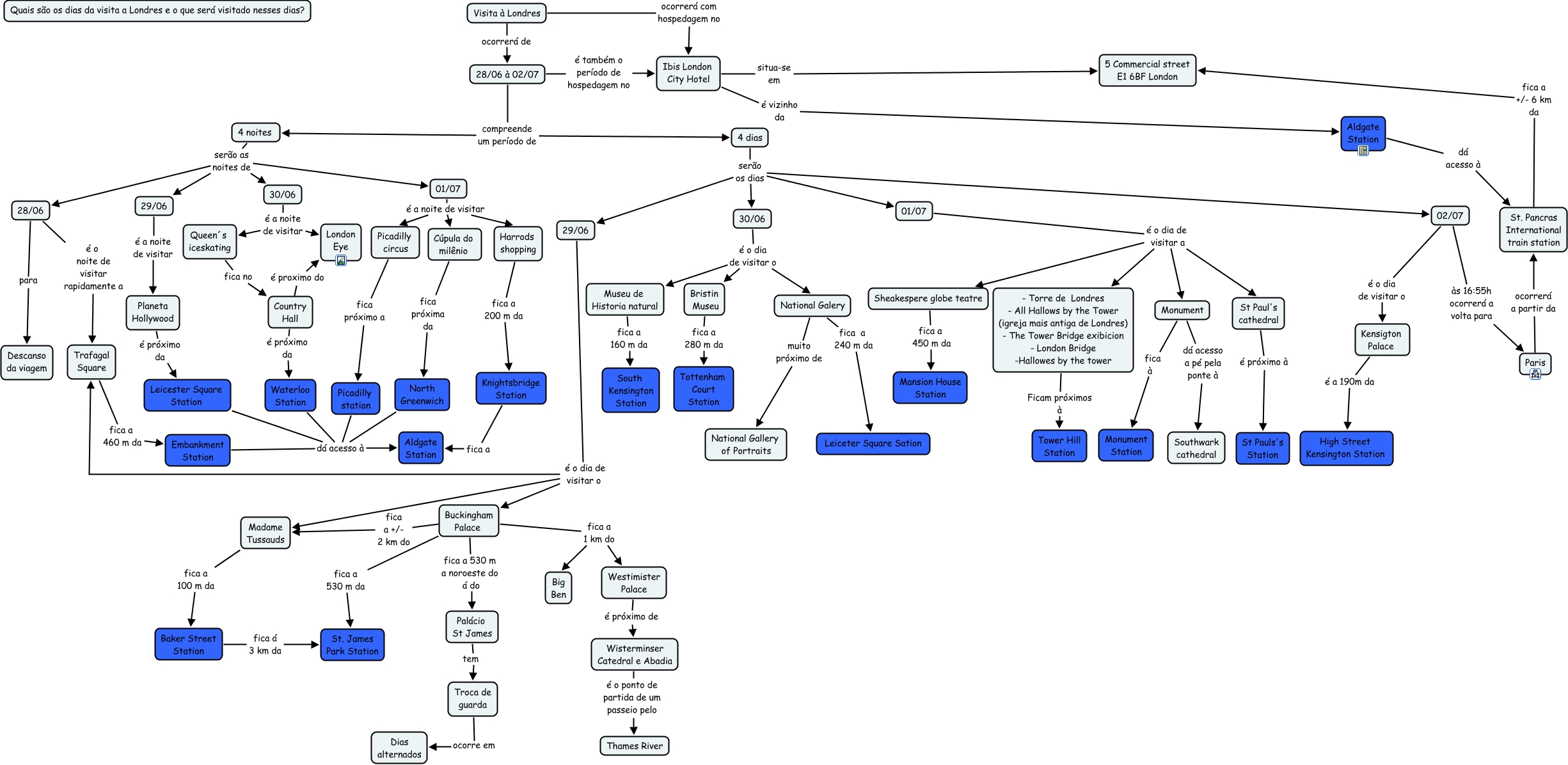 This Concept Map, created with IHMC CmapTools, has information related to: Londres, 29/06 é o dia de visitar o Trafagal Square, 4 dias serão os dias 02/07, Monument dá acesso a pé pela ponte à Southwark cathedral, Queen´s iceskating fica no Country Hall, Wisterminser Catedral e Abadia é o ponto de partida de um passeio pelo Thames River, Knightsbridge Station fica a Aldgate Station, 4 dias serão os dias 29/06, St. Pancras International train station fica a +/- 6 km da 5 Commercial street E1 6BF London, Buckingham Palace fica a 530 m da St. James Park Station, 30/06 é o dia de visitar o National Galery, National Galery muito próximo de National Gallery of Portraits, Trafagal Square fica a 460 m da Embankment Station, 4 dias serão os dias 01/07, 02/07 às 16:55h ocorrerá a volta para Paris, 01/07 é a noite de visitar Cúpula do milênio, Ibis London City Hotel é vizinho da Aldgate Station, 28/06 à 02/07 compreende um período de 4 noites, St Paul's cathedral é próximo à St Pauls's Station, Paris ocorrerá a partir da St. Pancras International train station, National Galery fica a 240 m da Leiceter Square Sation