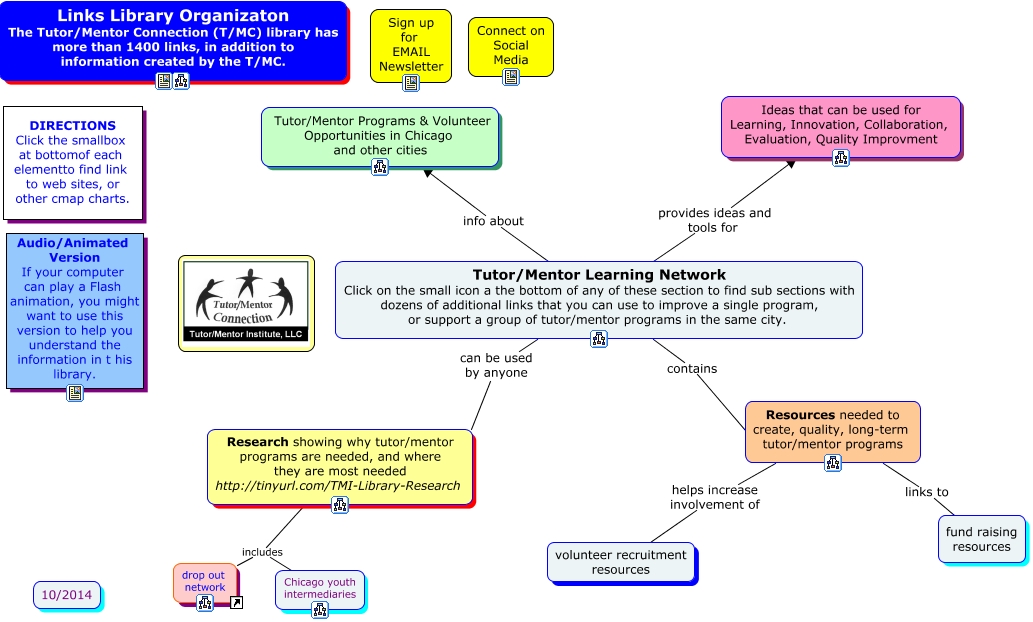 This Concept Map, created with IHMC CmapTools, has information related to: Learning Network Library, Research showing why tutor/mentor programs are needed, and where they are most needed http://tinyurl.com/TMI-Library-Research includes drop out network, Tutor/Mentor Learning Network Click on the small icon a the bottom of any of these section to find sub sections with dozens of additional links that you can use to improve a single program, or support a group of tutor/mentor programs in the same city. can be used by anyone Research showing why tutor/mentor programs are needed, and where they are most needed http://tinyurl.com/TMI-Library-Research, Tutor/Mentor Learning Network Click on the small icon a the bottom of any of these section to find sub sections with dozens of additional links that you can use to improve a single program, or support a group of tutor/mentor programs in the same city. contains Resources needed to create, quality, long-term tutor/mentor programs, Resources needed to create, quality, long-term tutor/mentor programs helps increase involvement of volunteer recruitment resources, Tutor/Mentor Learning Network Click on the small icon a the bottom of any of these section to find sub sections with dozens of additional links that you can use to improve a single program, or support a group of tutor/mentor programs in the same city. info about Tutor/Mentor Programs & Volunteer Opportunities in Chicago and other cities, Research showing why tutor/mentor programs are needed, and where they are most needed http://tinyurl.com/TMI-Library-Research includes Chicago youth intermediaries, Tutor/Mentor Learning Network Click on the small icon a the bottom of any of these section to find sub sections with dozens of additional links that you can use to improve a single program, or support a group of tutor/mentor programs in the same city. provides ideas and tools for Ideas that can be used for Learning, Innovation, Collaboration, Evaluation, Quality Improvment, Resources needed to create, quality, long-term tutor/mentor programs links to fund raising resources