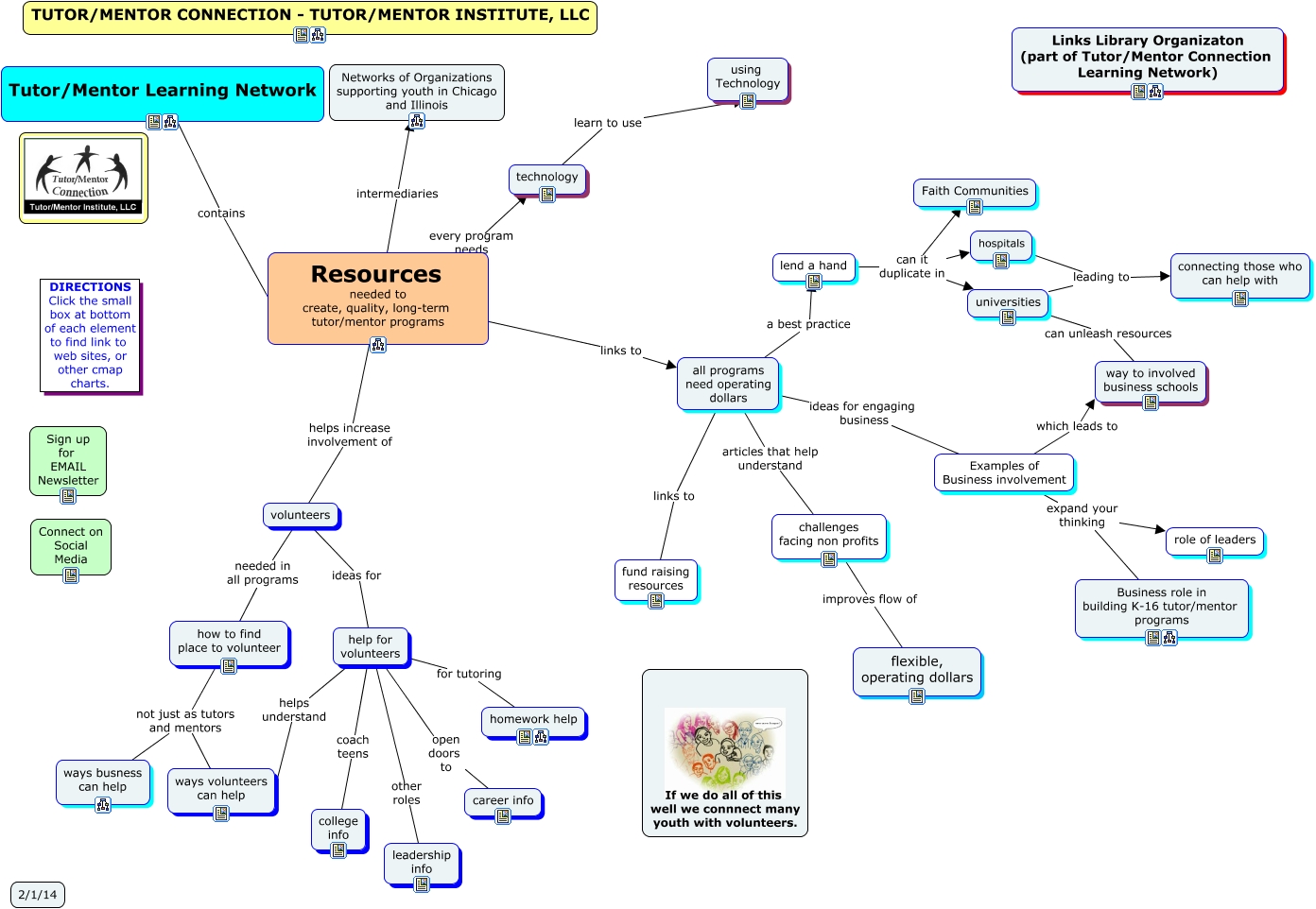 This Concept Map, created with IHMC CmapTools, has information related to: Learning Library - Resource Links, lend a hand can it duplicate in hospitals, help for volunteers for tutoring homework help, hospitals leading to connecting those who can help with, how to find place to volunteer not just as tutors and mentors ways busness can help, technology learn to use using Technology, universities leading to connecting those who can help with, universities can unleash resources way to involved business schools, Examples of Business involvement which leads to way to involved business schools, Resources needed to create, quality, long-term tutor/mentor programs every program needs technology, Resources needed to create, quality, long-term tutor/mentor programs helps increase involvement of volunteers, Resources needed to create, quality, long-term tutor/mentor programs links to all programs need operating dollars, Examples of Business involvement expand your thinking Business role in building K-16 tutor/mentor programs, lend a hand can it duplicate in Faith Communities, Tutor/Mentor Learning Network contains Resources needed to create, quality, long-term tutor/mentor programs, all programs need operating dollars links to fund raising resources, help for volunteers open doors to career info, challenges facing non profits improves flow of flexible, operating dollars, Examples of Business involvement expand your thinking role of leaders, all programs need operating dollars ideas for engaging business Examples of Business involvement, Resources needed to create, quality, long-term tutor/mentor programs intermediaries Networks of Organizations supporting youth in Chicago and Illinois