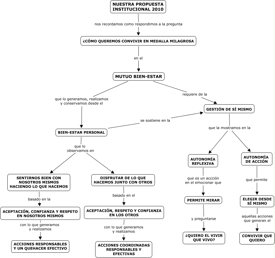 Este Cmap, tiene información relacionada con: 2a junio 2010, GESTIÓN DE SÍ MISMO que la mostramos en la AUTONOMÍA REFLEXIVA, DISFRUTAR DE LO QUE HACEMOS JUNTO CON OTROS basado en el ACEPTACIÓN, RESPETO Y CONFIANZA EN LOS OTROS, BIEN-ESTAR PERSONAL que lo observamos en DISFRUTAR DE LO QUE HACEMOS JUNTO CON OTROS, ¿CÓMO QUEREMOS CONVIVIR EN MEDALLA MILAGROSA en el MUTUO BIEN-ESTAR, MUTUO BIEN-ESTAR requiere de la GESTIÓN DE SÍ MISMO, PERMITE MIRAR y preguntarse ¿QUIERO EL VIVIR QUE VIVO?, ACEPTACIÓN, RESPETO Y CONFIANZA EN LOS OTROS con lo que generamos y realizamos ACCIONES COORDINADAS RESPONSABLES Y EFECTIVAS, NUESTRA PROPUESTA INSTITUCIONAL 2010 nos recordamos como respondimos a la pregunta ¿CÓMO QUEREMOS CONVIVIR EN MEDALLA MILAGROSA, ACEPTACIÓN, CONFIANZA Y RESPETO EN NOSOTROS MISMOS con lo que generamos y realizamos ACCIONES RESPONSABLES Y UN QUEHACER EFECTIVO, SENTIRNOS BIEN CON NOSOTROS MISMOS HACIENDO LO QUE HACEMOS basado en la ACEPTACIÓN, CONFIANZA Y RESPETO EN NOSOTROS MISMOS, ELEGIR DESDE SÍ MISMO aquellas acciones que generan el CONVIVIR QUE QUIERO, GESTIÓN DE SÍ MISMO que la mostramos en la AUTONOMÍA DE ACCIÓN, BIEN-ESTAR PERSONAL que lo observamos en SENTIRNOS BIEN CON NOSOTROS MISMOS HACIENDO LO QUE HACEMOS, BIEN-ESTAR PERSONAL se sostiene en la GESTIÓN DE SÍ MISMO, AUTONOMÍA DE ACCIÓN que permite ELEGIR DESDE SÍ MISMO, AUTONOMÍA REFLEXIVA que es un accción en el emocionar que PERMITE MIRAR, MUTUO BIEN-ESTAR que lo generamos, realizamos y conservamos desde el BIEN-ESTAR PERSONAL