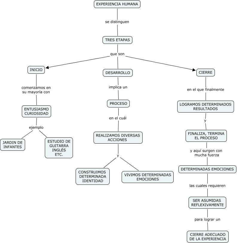 Este Cmap, tiene información relacionada con: Experiencia Humana de Cierre 5º años, INICIO comenzamos en su mayoría con ENTUSIASMO CURIOSIDAD, DESARROLLO implica un PROCESO, DETERMINADAS EMOCIONES las cuales requieren SER ASUMIDAS REFLEXIVAMENTE, ENTUSIASMO CURIOSIDAD ejemplo JARDIN DE INFANTES, EXPERIENCIA HUMANA se distinguen TRES ETAPAS, TRES ETAPAS que son INICIO, CIERRE en el que finalmente LOGRAMOS DETERMINADOS RESULTADOS, REALIZAMOS DIVERSAS ACCIONES y CONSTRUIMOS DETERMINADA IDENTIDAD, LOGRAMOS DETERMINADOS RESULTADOS y FINALIZA, TERMINA EL PROCESO, TRES ETAPAS que son CIERRE, TRES ETAPAS que son DESARROLLO, REALIZAMOS DIVERSAS ACCIONES y VIVIMOS DETERMINADAS EMOCIONES, SER ASUMIDAS REFLEXIVAMENTE para lograr un CIERRE ADECUADO DE LA EXPERIENCIA, FINALIZA, TERMINA EL PROCESO y aquí surgen con mucha fuerza DETERMINADAS EMOCIONES, ENTUSIASMO CURIOSIDAD ejemplo ESTUDIO DE GUITARRA INGLÉS ETC., PROCESO en el cuál REALIZAMOS DIVERSAS ACCIONES