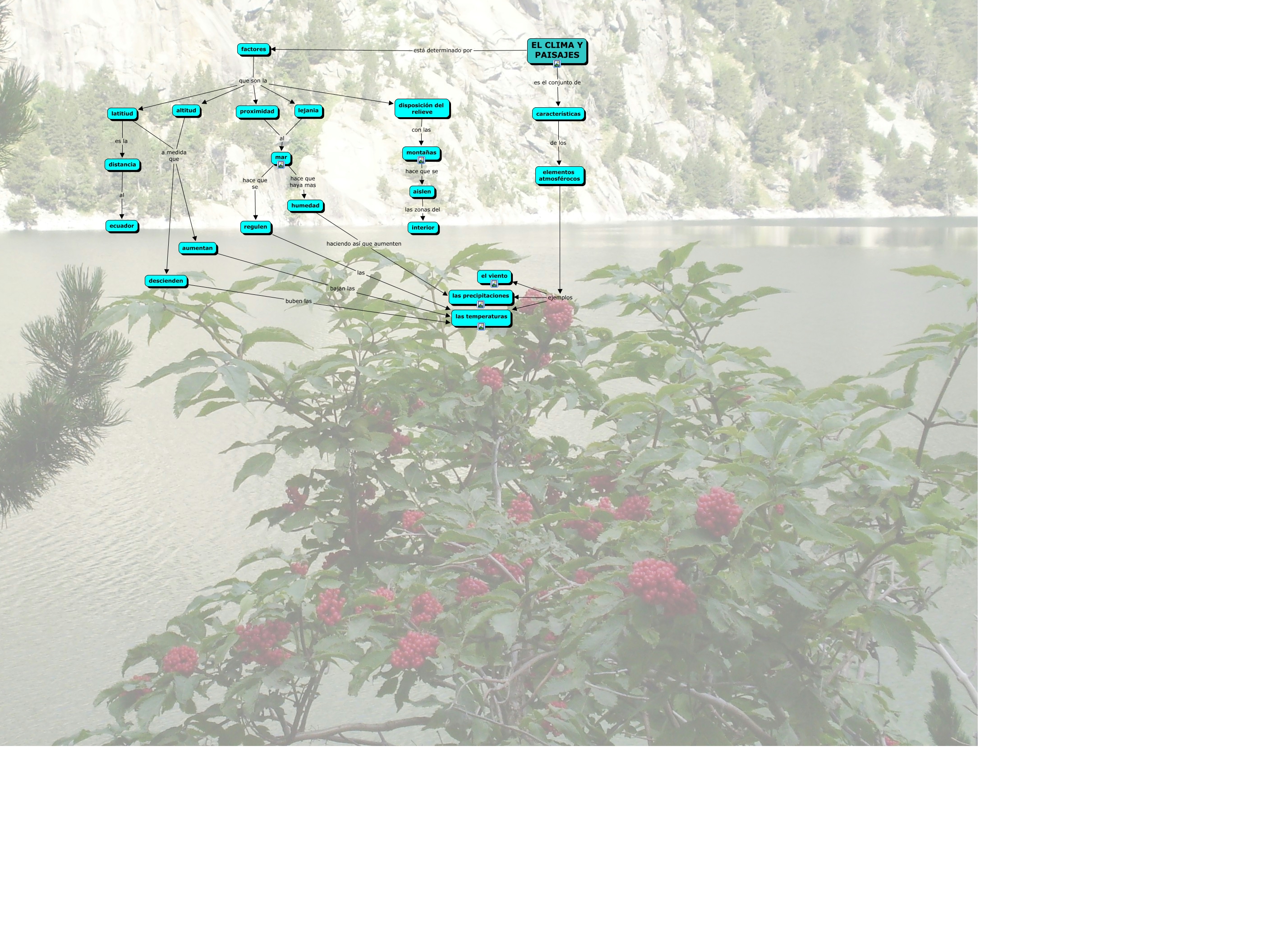Este Cmap, tiene información relacionada con: El clima y paisajes, elementos atmosférocos ejemplos el viento, EL CLIMA Y PAISAJES es el conjunto de características, mar hace que se regulen, montañas hace que se aislen, latitiud a medida que aumentan, descienden buben las las temperaturas, latitiud a medida que descienden, factores que son la latitiud, características de los elementos atmosférocos, factores que son la lejania, elementos atmosférocos ejemplos las temperaturas, lejania al mar, altitud a medida que descienden, aumentan bajan las las temperaturas, factores que son la disposición del relieve, disposición del relieve con las montañas, EL CLIMA Y PAISAJES está determinado por factores, regulen las las temperaturas, distancia al ecuador, altitud a medida que aumentan