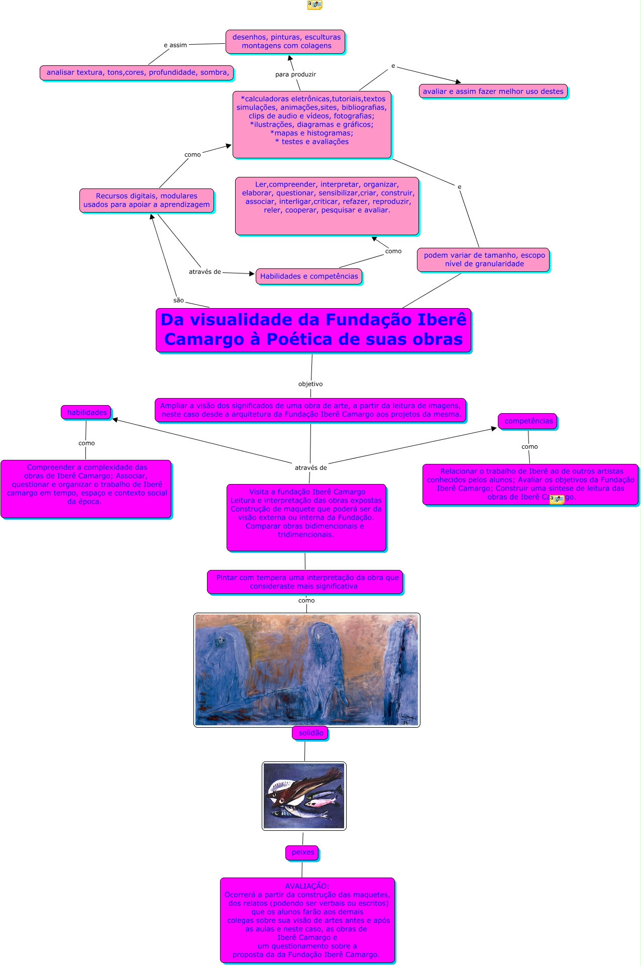 Esse mapa conceitual, produzido no IHMC CmapTools, tem a informação relacionada a: objeto de aprendizagem, peixes ???? AVALIAÇÃO: Ocorrerá a partir da construção das maquetes, dos relatos (podendo ser verbais ou escritos) que os alunos farão aos demais colegas sobre sua visão de artes antes e após as aulas e neste caso, as obras de Iberê Camargo e um questionamento sobre a proposta da da Fundação Iberê Camargo., desenhos, pinturas, esculturas montagens com colagens e assim analisar textura, tons,cores, profundidade, sombra,, ???? peixes, *calculadoras eletrônicas,tutoriais,textos simulações, animações,sites, bibliografias, clips de audio e vídeos, fotografias; *ilustrações, diagramas e gráficos; *mapas e histogramas; * testes e avaliações para produzir desenhos, pinturas, esculturas montagens com colagens, habilidades como Compreender a complexidade das obras de Iberê Camargo; Associar, questionar e organizar o trabalho de Iberê camargo em tempo, espaço e contexto social da época., Visita a fundação Iberê Camargo Leitura e interpretação das obras expostas Construção de maquete que poderá ser da visão externa ou interna da Fundação. Comparar obras bidimencionais e tridimencionais. ???? Pintar com tempera uma interpretação da obra que consideraste mais significativa, Pintar com tempera uma interpretação da obra que consideraste mais significativa como, Da visualidade da Fundação Iberê Camargo à Poética de suas obras são Recursos digitais, modulares usados para apoiar a aprendizagem, Habilidades e competências como Ler,compreender, interpretar, organizar, elaborar, questionar, sensibilizar,criar, construir, associar, interligar,criticar, refazer, reproduzir, reler, cooperar, pesquisar e avaliar., Recursos digitais, modulares usados para apoiar a aprendizagem como *calculadoras eletrônicas,tutoriais,textos simulações, animações,sites, bibliografias, clips de audio e vídeos, fotografias; *ilustrações, diagramas e gráficos; *mapas e histogramas; * testes e avaliações, Ampliar a visão dos significados de uma obra de arte, a partir da leitura de imagens, neste caso desde a arquitetura da Fundação Iberê Camargo aos projetos da mesma. através de habilidades, ???? solidão, Da visualidade da Fundação Iberê Camargo à Poética de suas obras objetivo Ampliar a visão dos significados de uma obra de arte, a partir da leitura de imagens, neste caso desde a arquitetura da Fundação Iberê Camargo aos projetos da mesma., *calculadoras eletrônicas,tutoriais,textos simulações, animações,sites, bibliografias, clips de audio e vídeos, fotografias; *ilustrações, diagramas e gráficos; *mapas e histogramas; * testes e avaliações e avaliar e assim fazer melhor uso destes, Ampliar a visão dos significados de uma obra de arte, a partir da leitura de imagens, neste caso desde a arquitetura da Fundação Iberê Camargo aos projetos da mesma. através de Visita a fundação Iberê Camargo Leitura e interpretação das obras expostas Construção de maquete que poderá ser da visão externa ou interna da Fundação. Comparar obras bidimencionais e tridimencionais., podem variar de tamanho, escopo nível de granularidade ???? Da visualidade da Fundação Iberê Camargo à Poética de suas obras, Recursos digitais, modulares usados para apoiar a aprendizagem através de Habilidades e competências, Ampliar a visão dos significados de uma obra de arte, a partir da leitura de imagens, neste caso desde a arquitetura da Fundação Iberê Camargo aos projetos da mesma. através de competências, *calculadoras eletrônicas,tutoriais,textos simulações, animações,sites, bibliografias, clips de audio e vídeos, fotografias; *ilustrações, diagramas e gráficos; *mapas e histogramas; * testes e avaliações e podem variar de tamanho, escopo nível de granularidade, peixes ???? AVALIAÇÃO: Ocorrerá a partir da construção das maquetes, dos relatos (podendo ser verbais ou escritos) que os alunos farão aos demais colegas sobre sua visão de artes antes e após as aulas e neste caso, as obras de Iberê Camargo e um questionamento sobre a proposta da da Fundação Iberê Camargo.